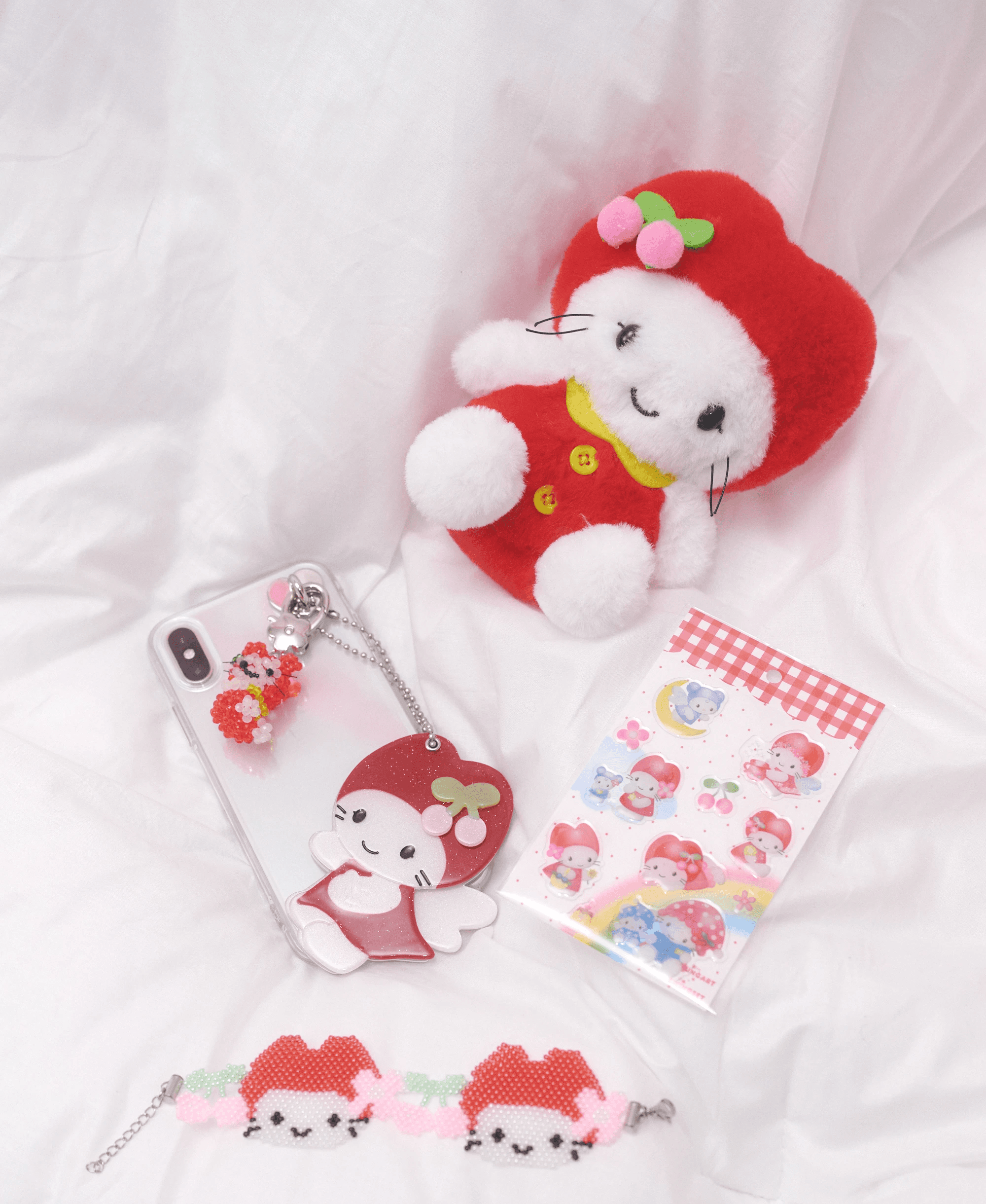 스윙셋x영아트 체리펫 인형 키링이에요. 복실복실한 퍼 원단에 노란색 카라와 단추 두 개를 달아 90년대 문방구 인형 감성을 되살렸어요. 머리 위 폼폼 체리가 포인트예요.