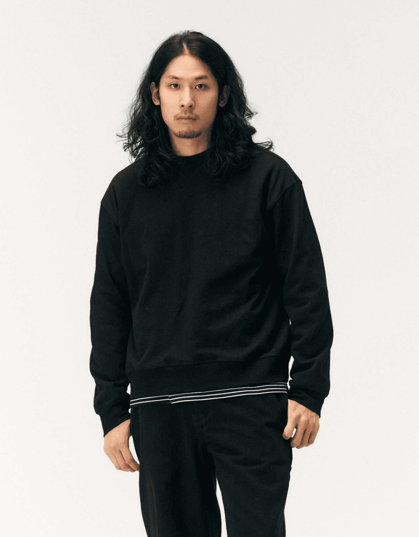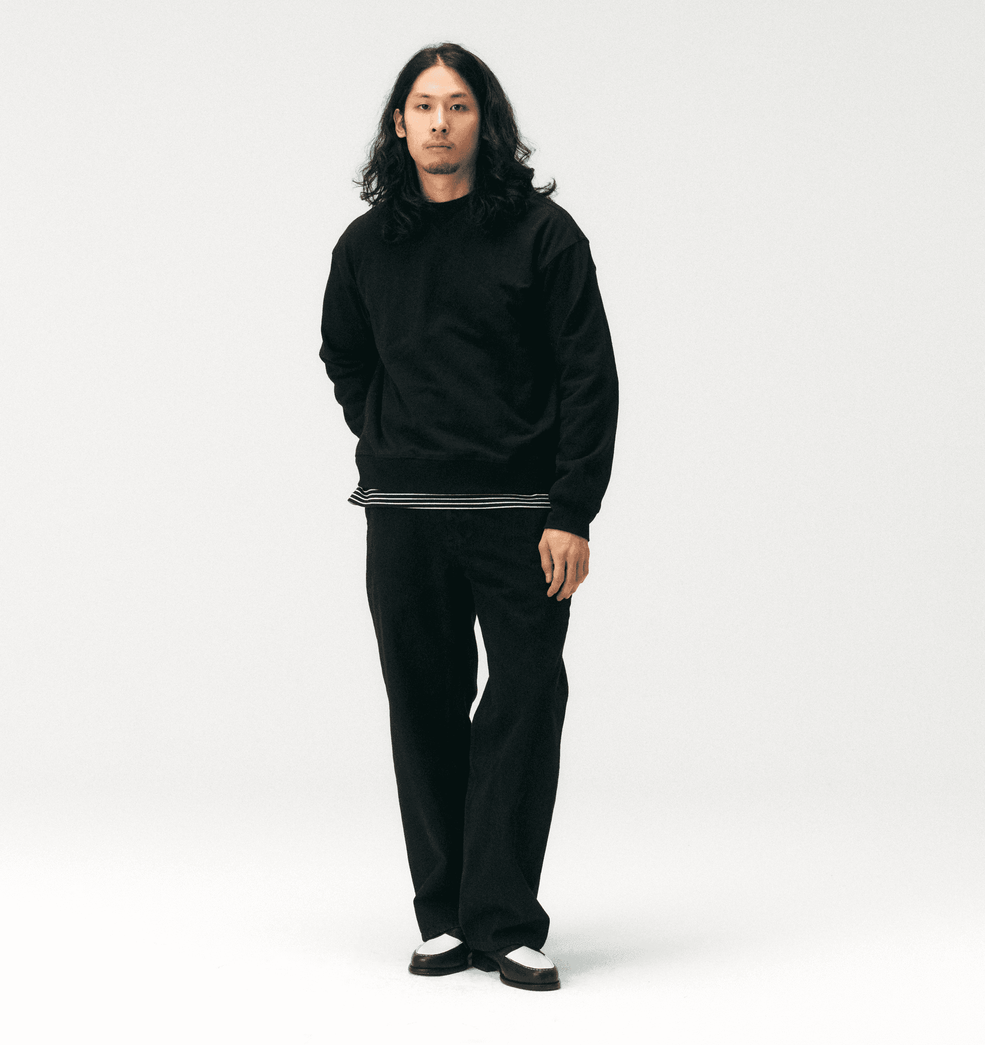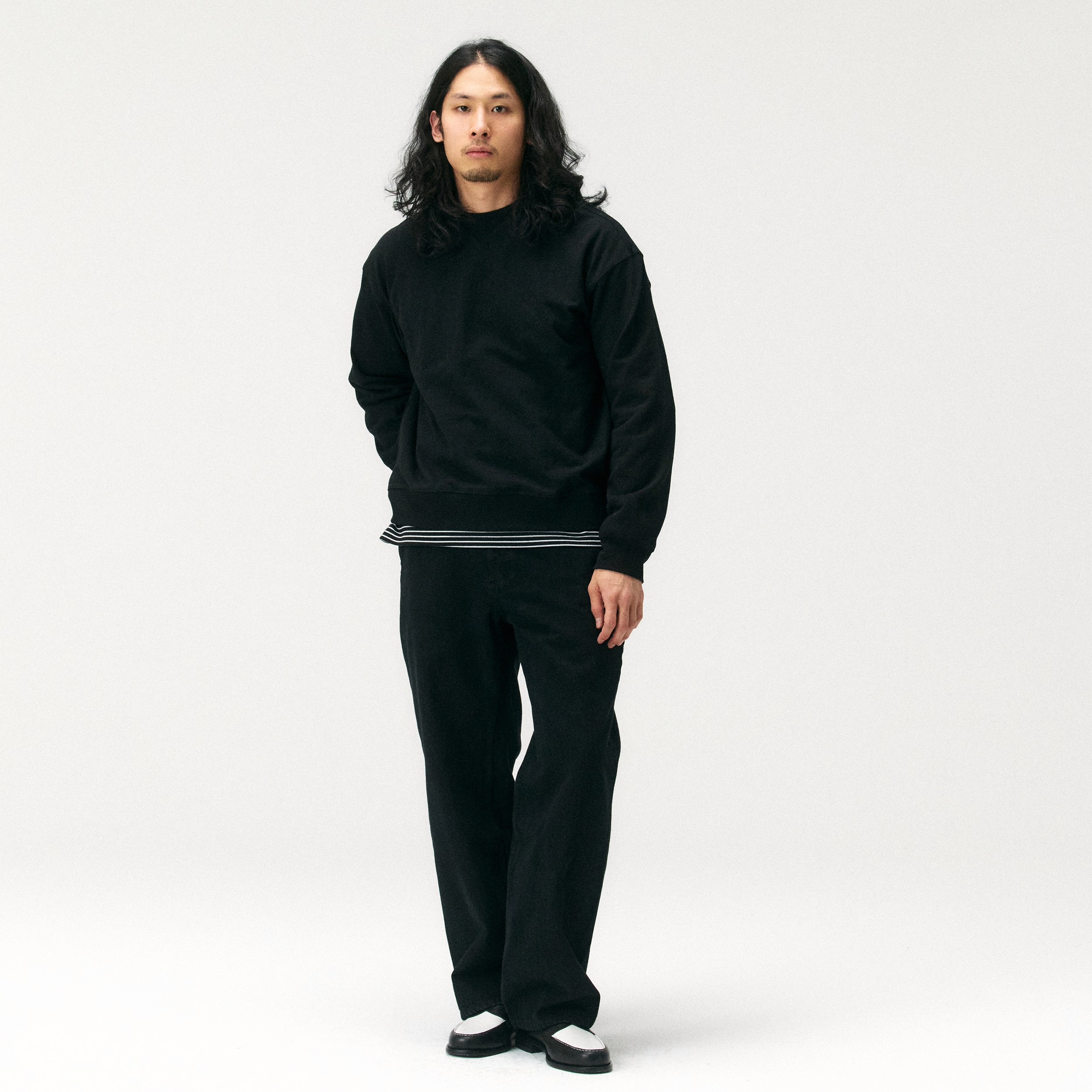 스트라이프 티셔츠에 블랙 스웨트셔츠를 레이어드해 가벼운 포인트를 주었습니다. 블랙 셀비지 데님으로 실루엣을 안정감 있게 잡고, 흑백 대비가 돋보이는 로퍼로 마무리했습니다. 일상에서 가장 편안하면서도 깔끔하게 즐길 수 있는 데일리 캐주얼 룩의 정석을 제안합니다.