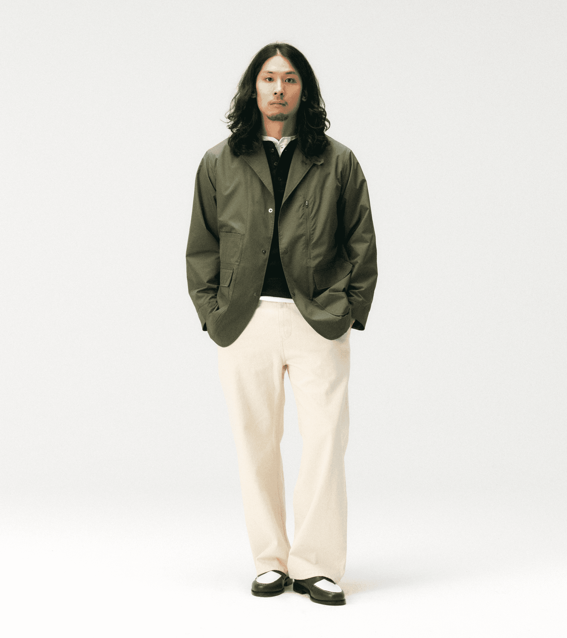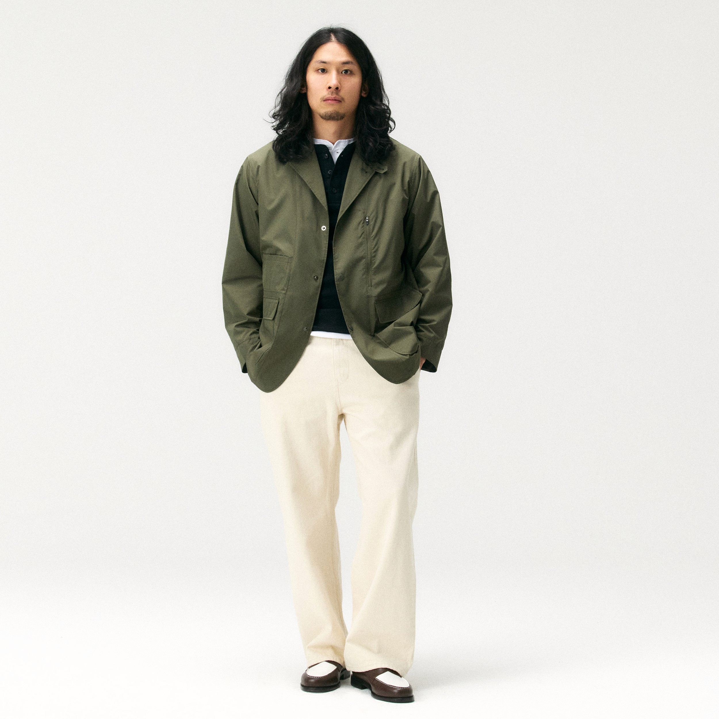 워드로브 스탠다드의 카키 유틸리티 자켓에 헨리넥 티셔츠를 이중 레이어드하여 깊이감을 더했습니다. 에크루 셀비지 데님으로 전체 톤을 부드럽게 연결하고, 브라운&화이트 페니 로퍼로 마무리해 캐주얼함과 단정함의 균형을 잡은 감각적인 스타일입니다.