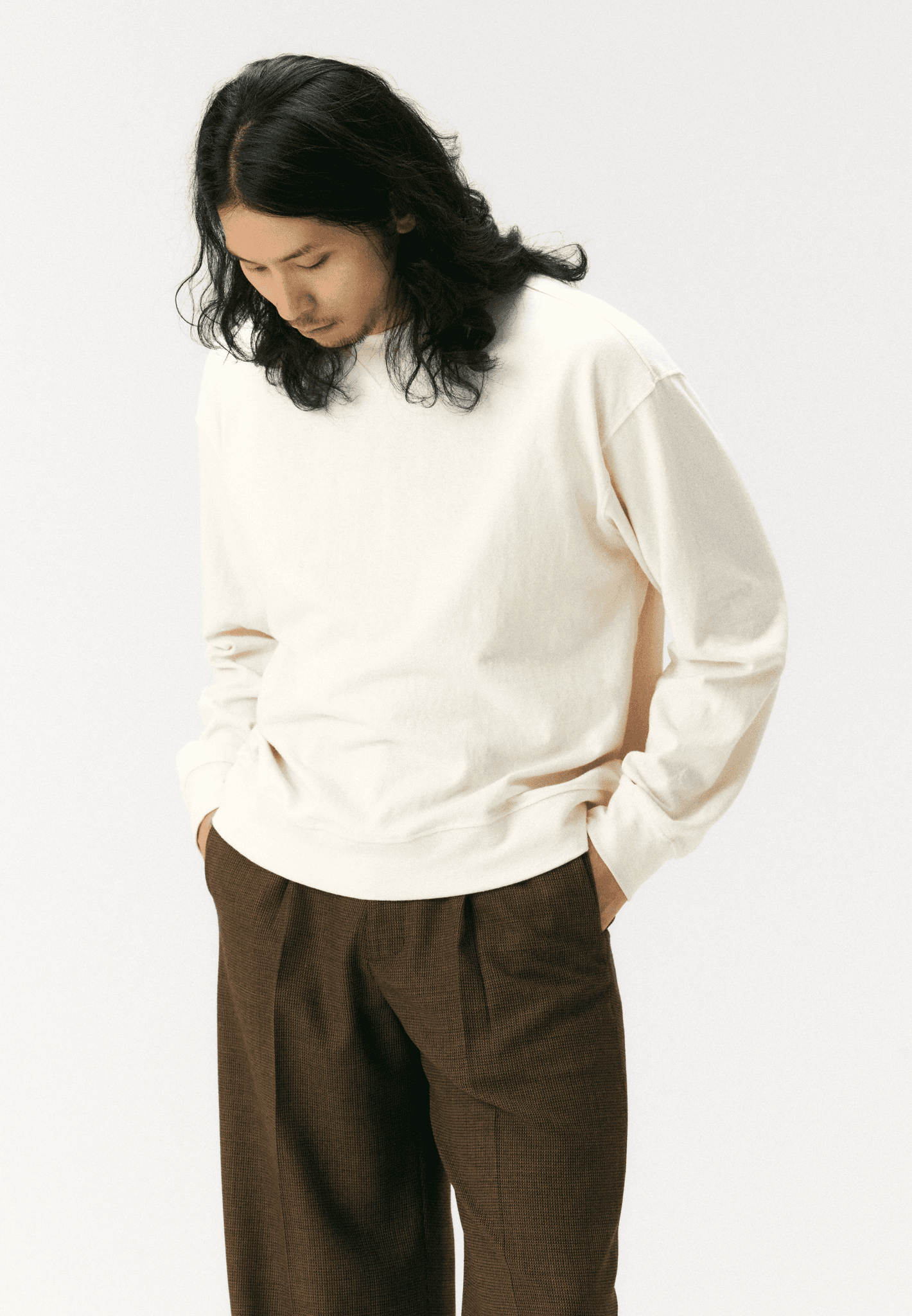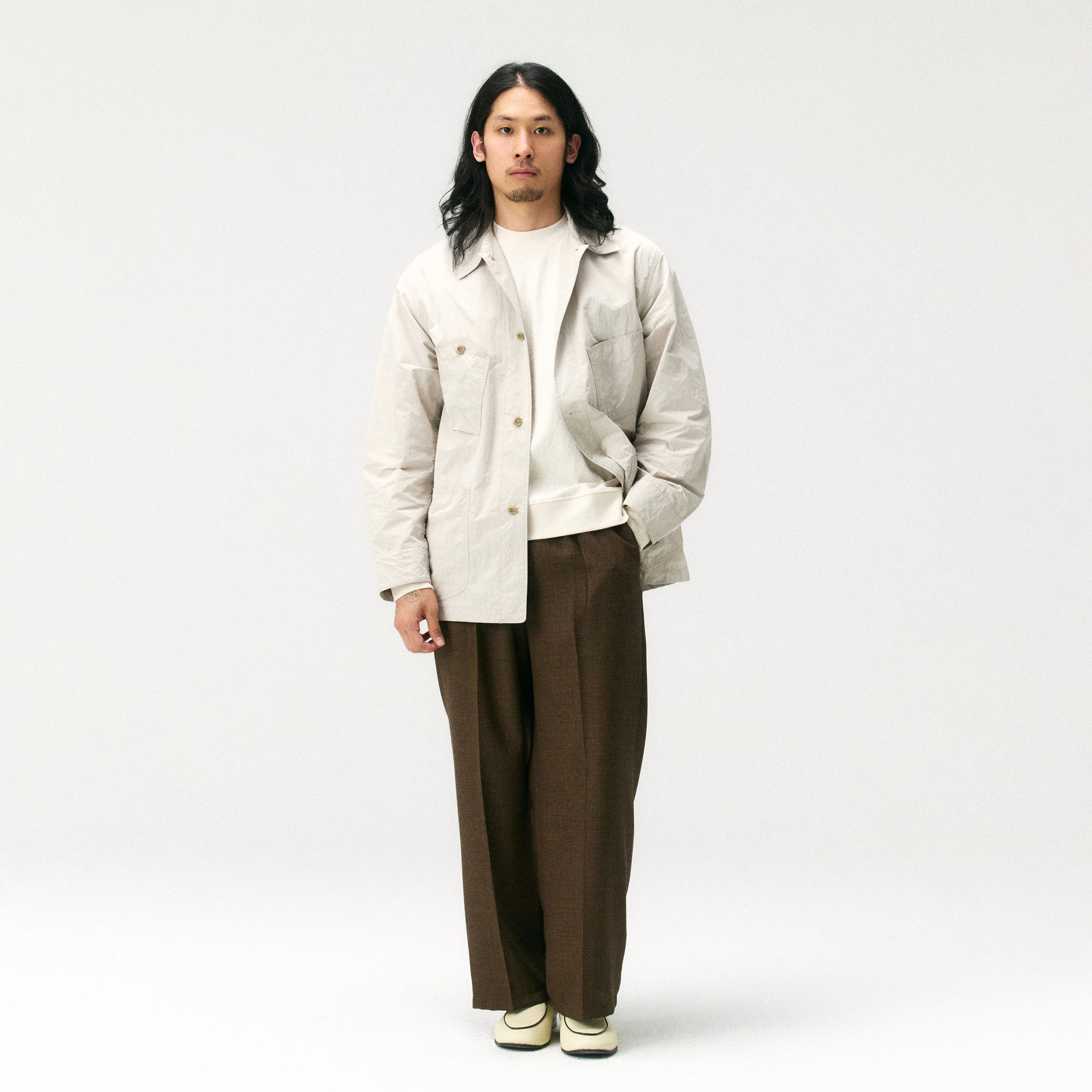 가볍고 유연한 리사이클 스웨트셔츠에 워크 초어 자켓을 걸쳐 일교차 큰 날씨에 최적화된 편안함을 구현했습니다. 브라운 체크 슬랙스로 실루엣의 깊이와 여유를 더하고, 크림 컬러 로퍼로 마무리해 무게감은 덜어내면서도 단정하고 깔끔한 인상을 완성한 고감도 데일리 룩입니다.