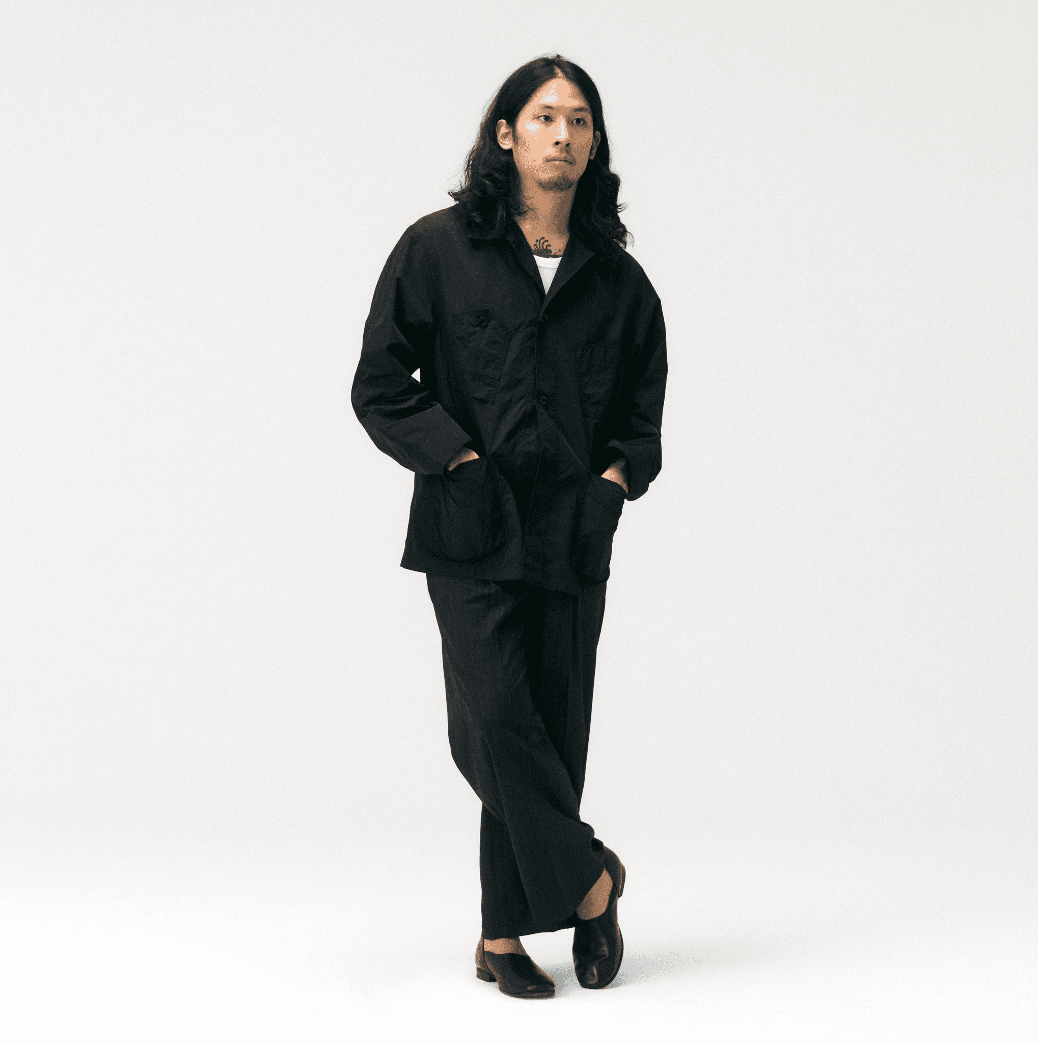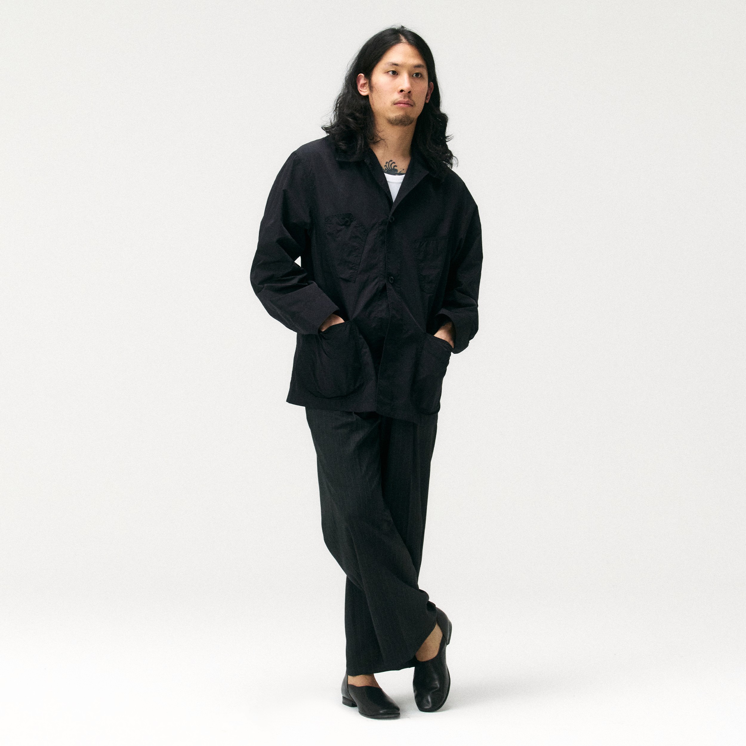 워드로브 스탠다드의 초어 자켓에 화이트 슬리브리스를 매치해 경쾌한 대비감을 주었습니다. 잔잔한 스트라이프 디테일의 와이드 슬랙스로 실루엣에 리듬과 여유를 더하고, 포스트맨의 플랫 로퍼로 마무리하여 차분하고 정제된 톤의 고감도 스타일링을 완성했습니다.
