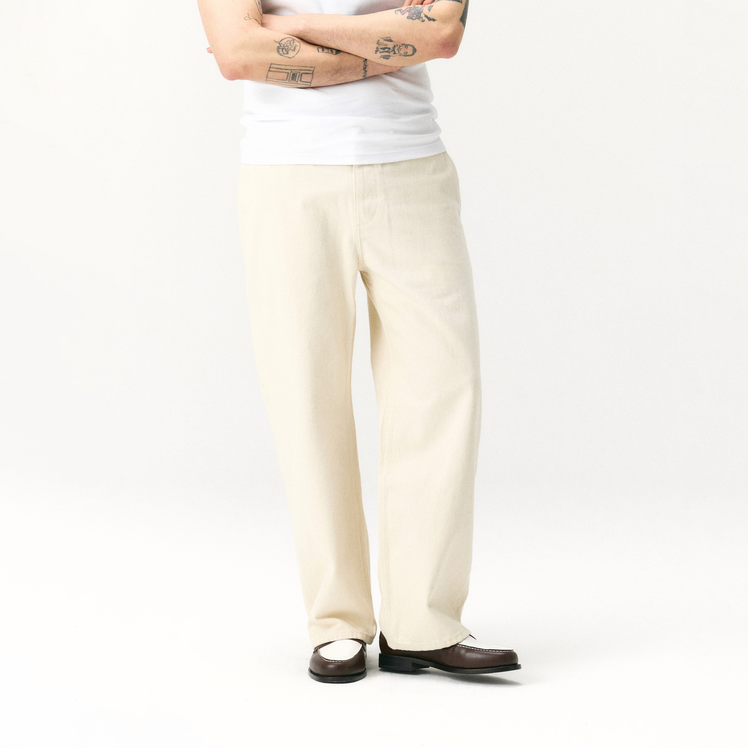 헤인즈 헨리넥과 셀비지 데님을 매치해 부드럽고 간결한 여름 룩을 연출했습니다. 심심할 수 있는 조합에 브라운&화이트 로퍼로 확실한 포인트를 더해 감각을 높였습니다. 꾸미지 않아도 자연스러운 멋이 살아나며, 지금 시즌 가장 활용도 높은 데일리 룩의 정석을 제안합니다.