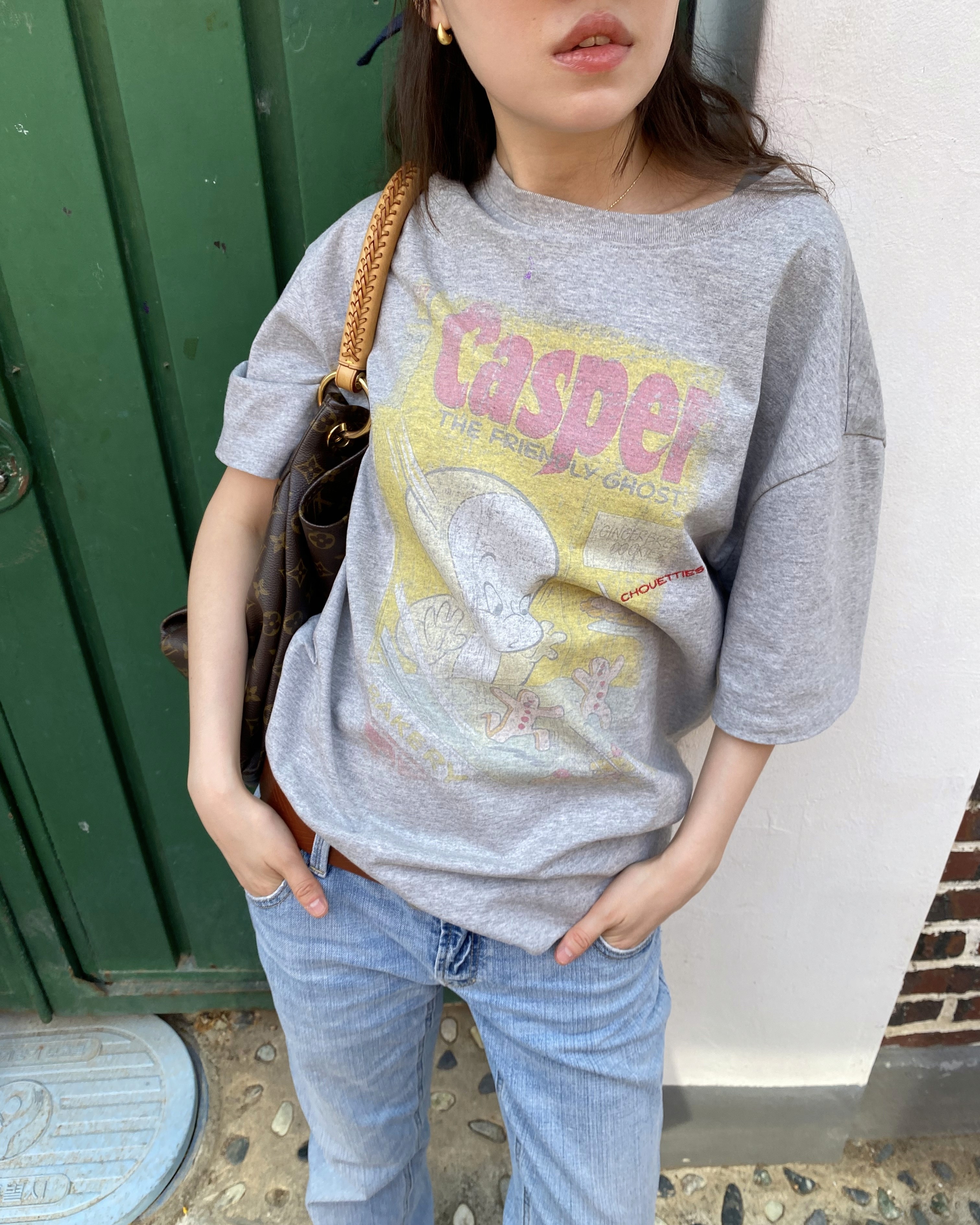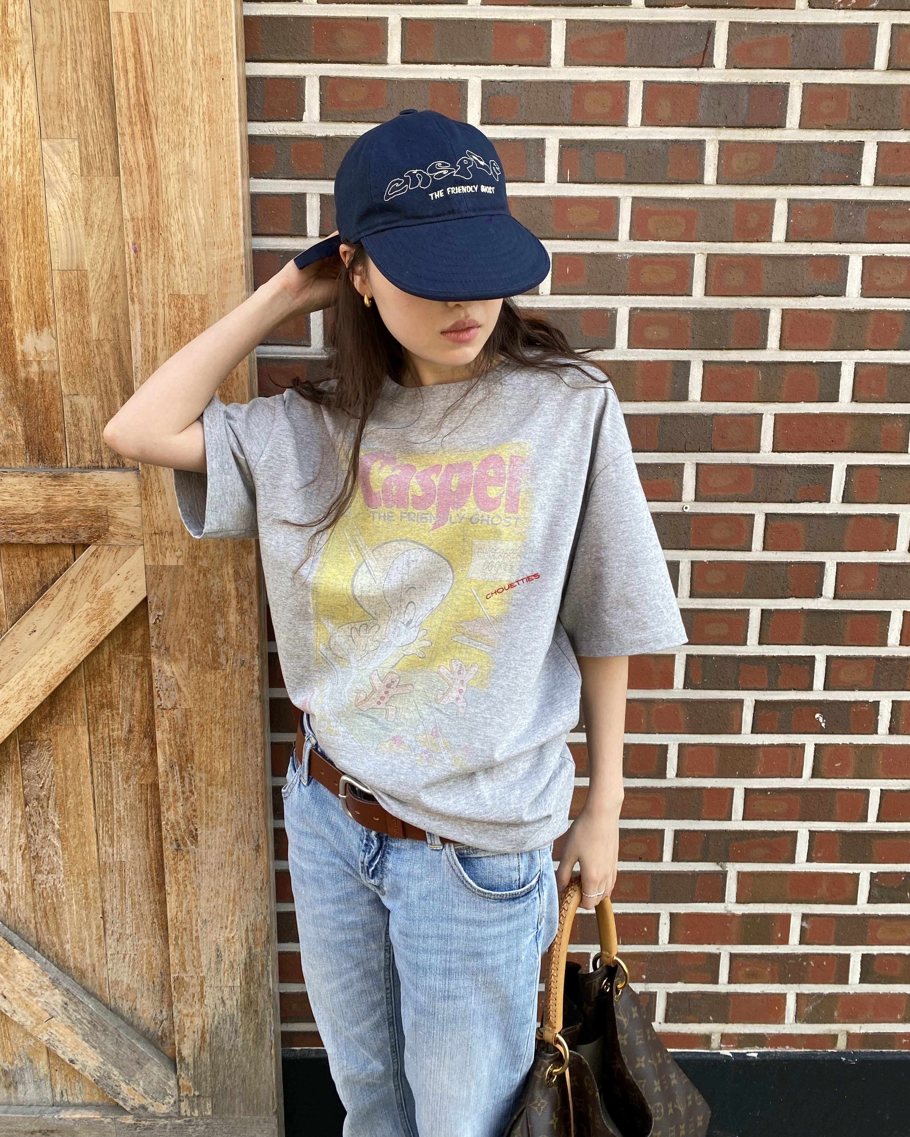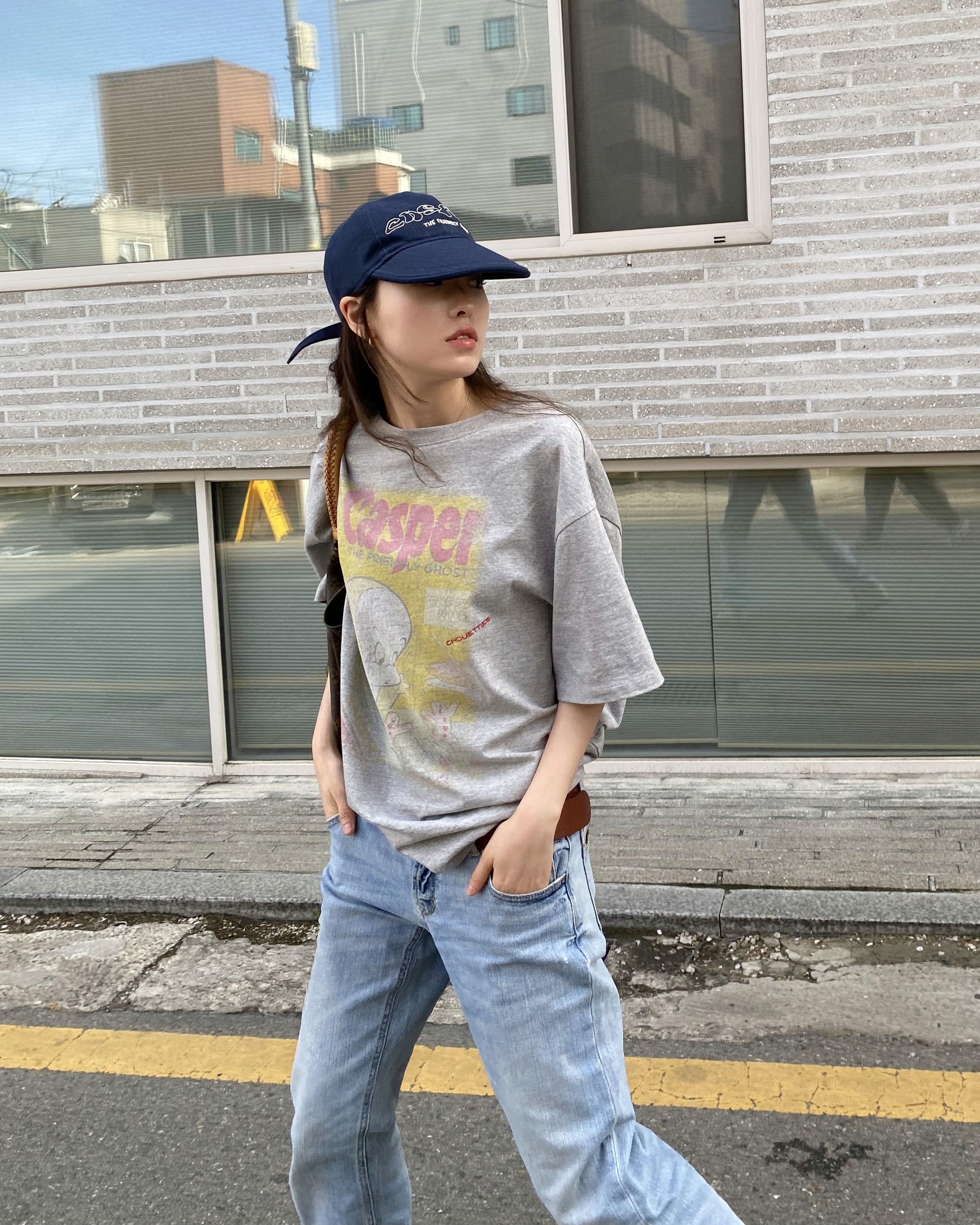 캐스퍼 콜라보 티셔츠와 모자의 쿨한 매치. 캐스퍼의 유니크한 그래픽과 채원의 믹스매치를 참고해보세요.