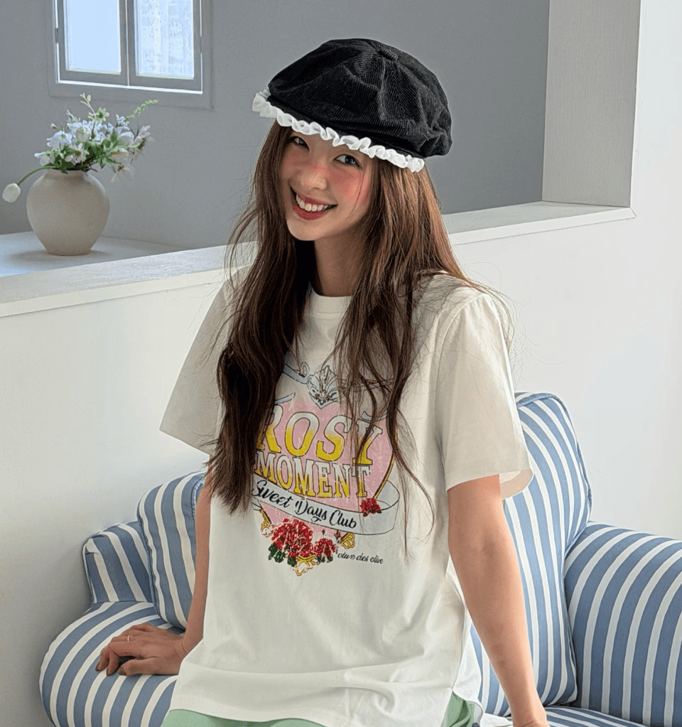 어디에나 잘 어울리는 레귤러핏의 이너로 잔잔한 플라워 프린팅이 돋보이는 하프 슬리프 티셔츠입니다.