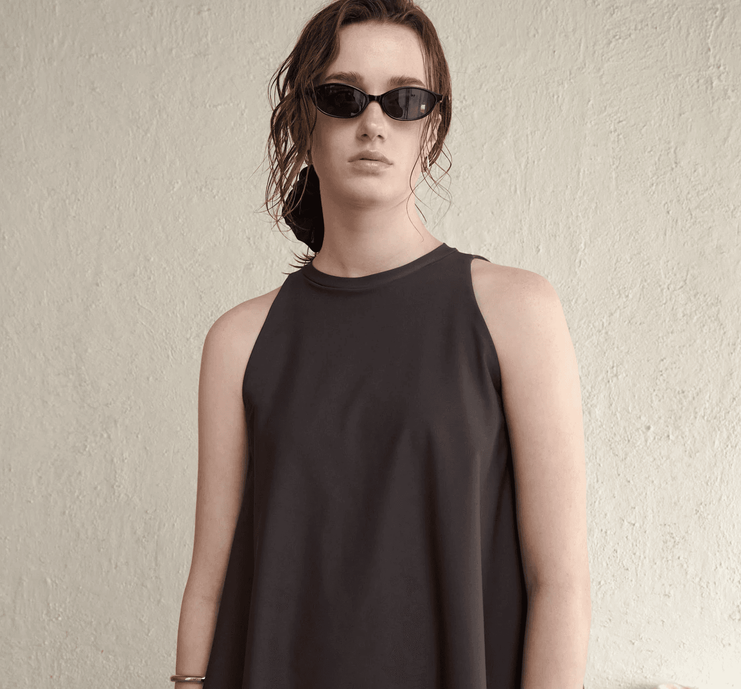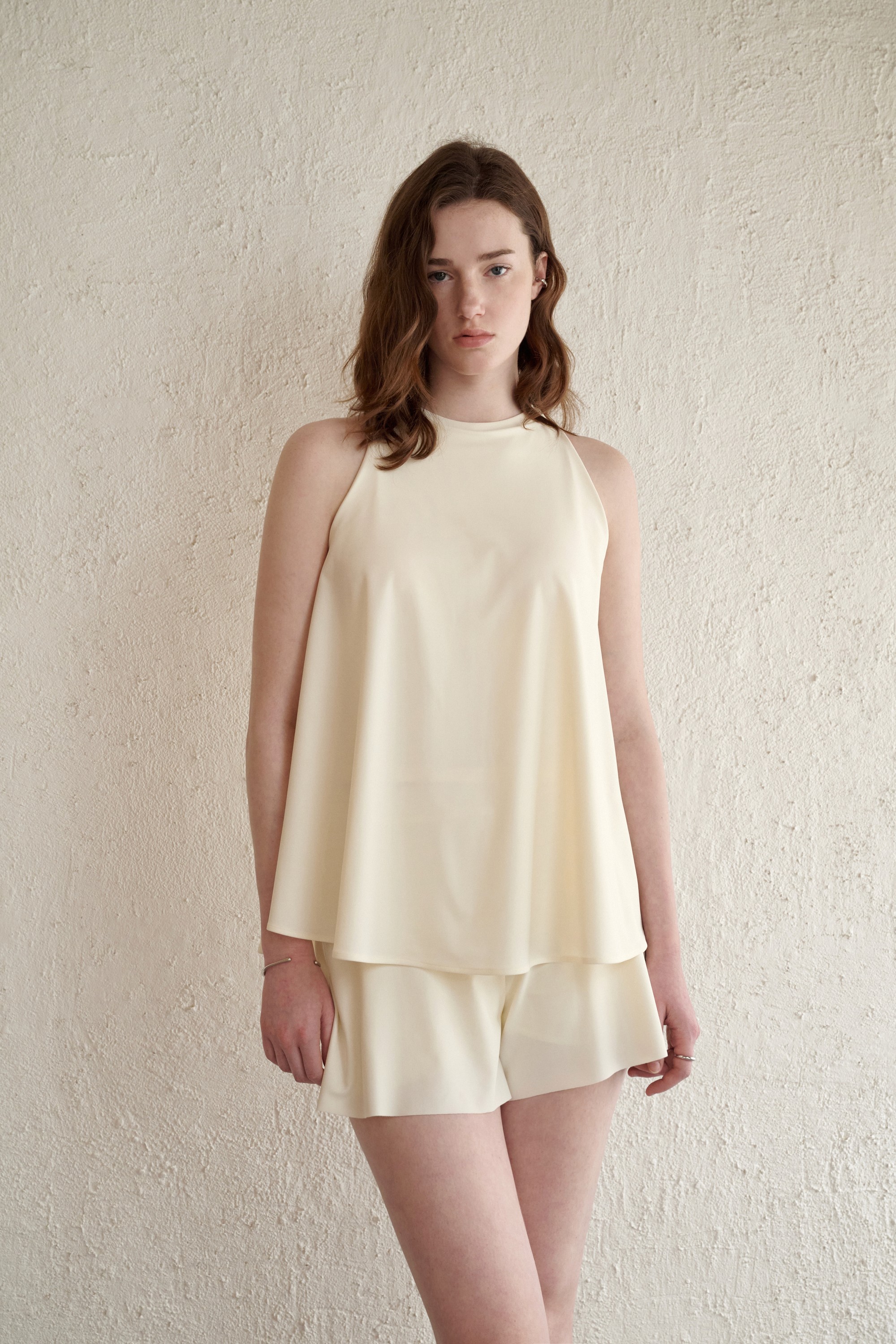 부드럽게 퍼지는 A라인 플레어 핏으로 자연스러운 체형 보정 실루엣을 완성하며, 암홀을 감싸는 사이드 커버와 백 버튼 디테일로 군살은 정돈하고 감각적인 포인트와 편안함을 더했습니다.