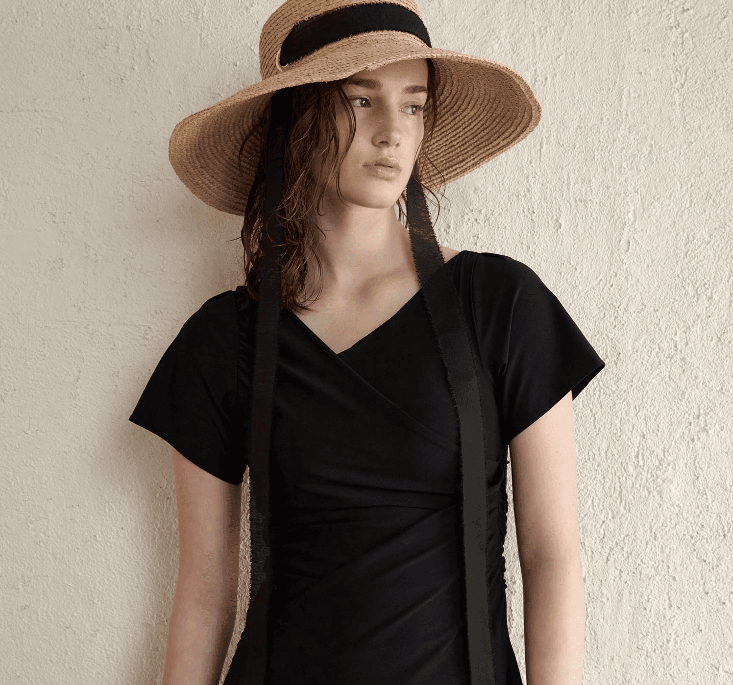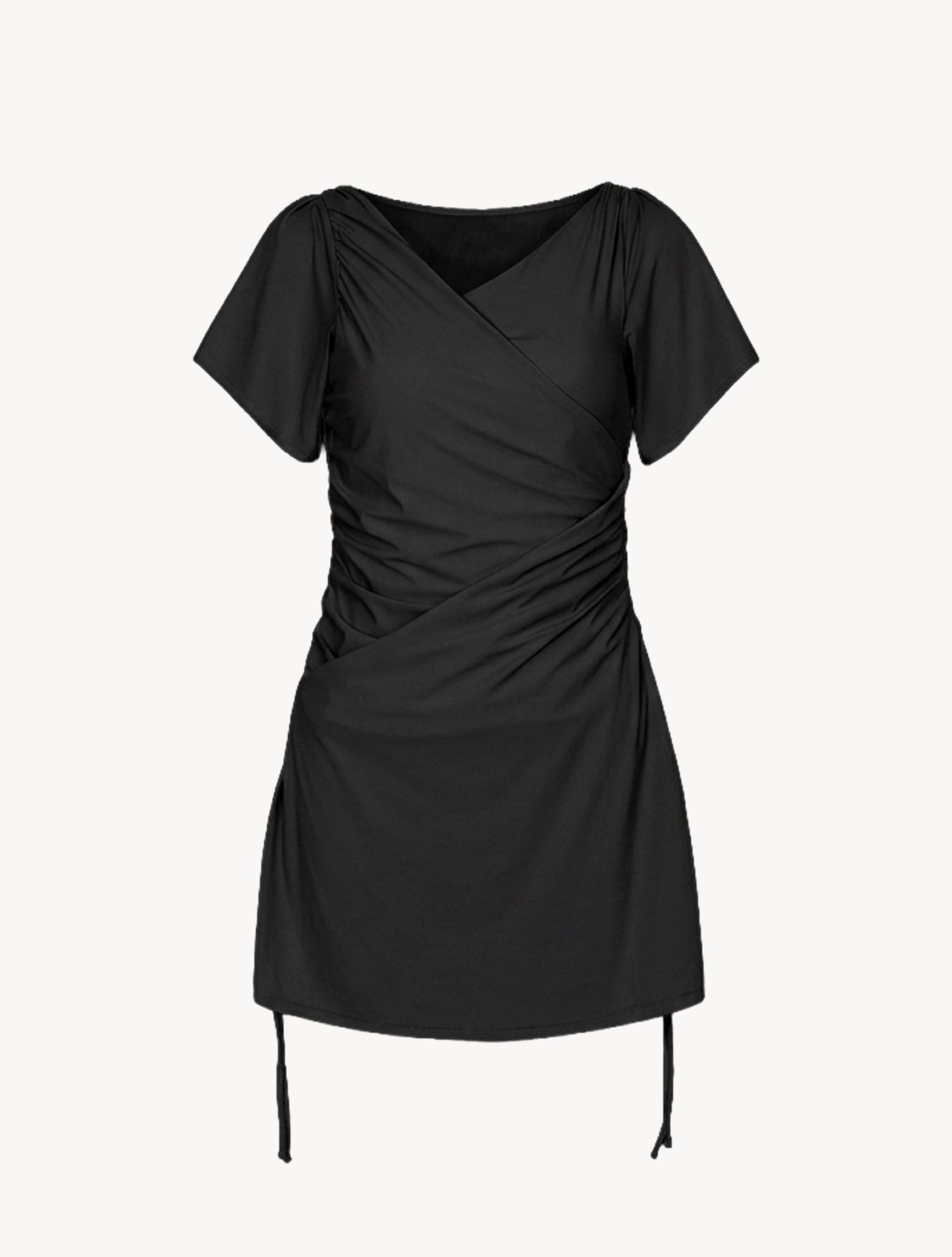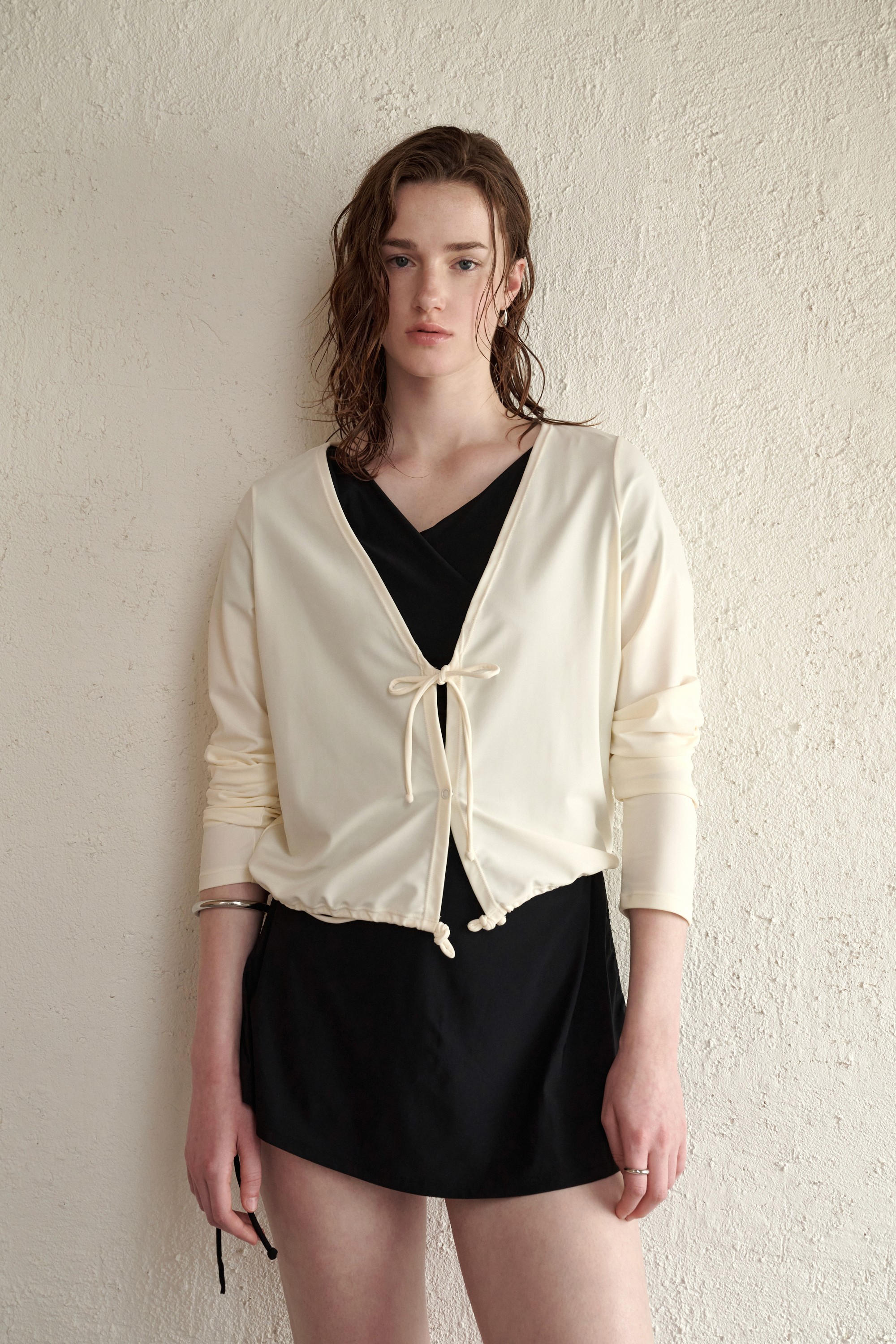 브이 넥에 랩 스타일과 사이드 셔링을 더해 바디 라인을 입체적으로 살려요. A라인 실루엣과 조절 가능한 밑단 스트링으로 힙라인은 편안하게 커버하며 자유로운 핏 연출이 가능해요.