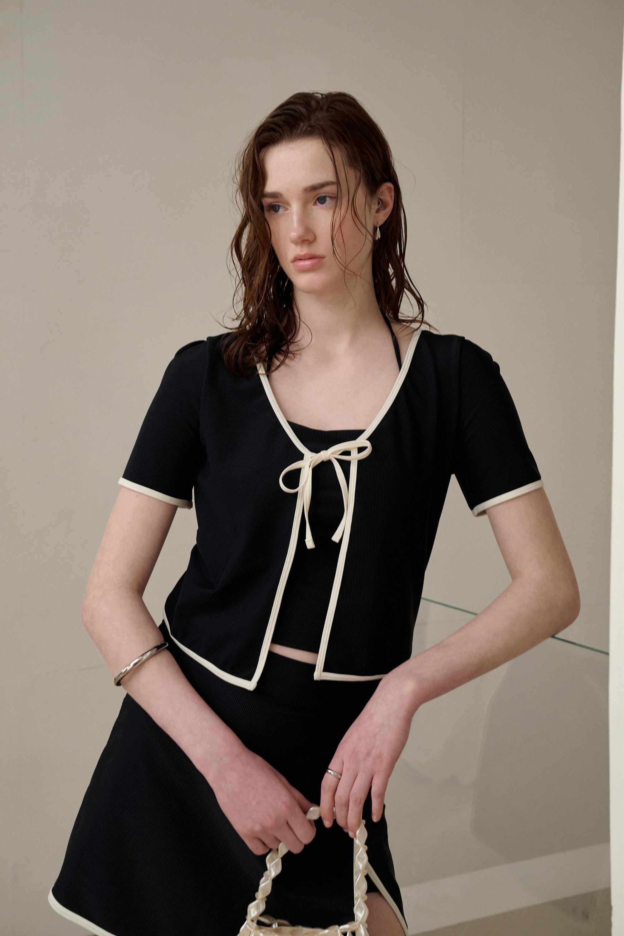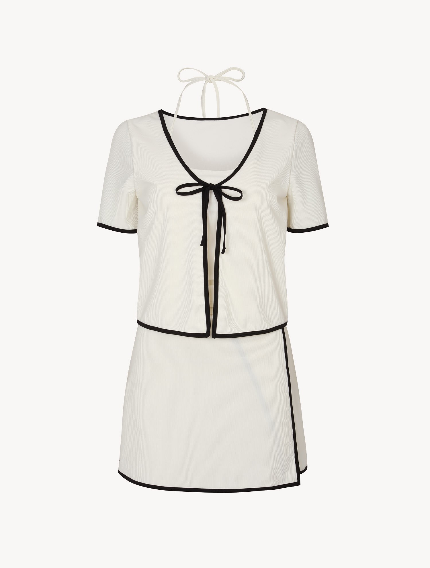 배색 바인딩과 리본 타이 디테일이 만드는 페미닌한 순간. 가디건을 걸친 듯한 일체형 디자인에 사이드 슬릿과 A라인을 더해 활동성과 힙라인 커버를 동시에 완성해요.