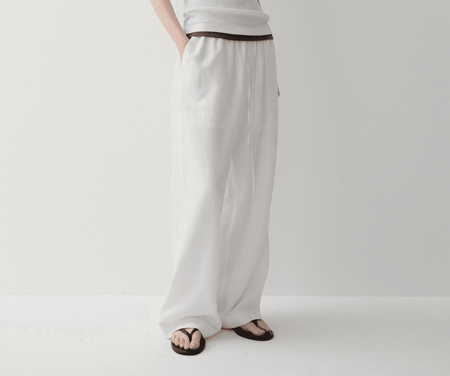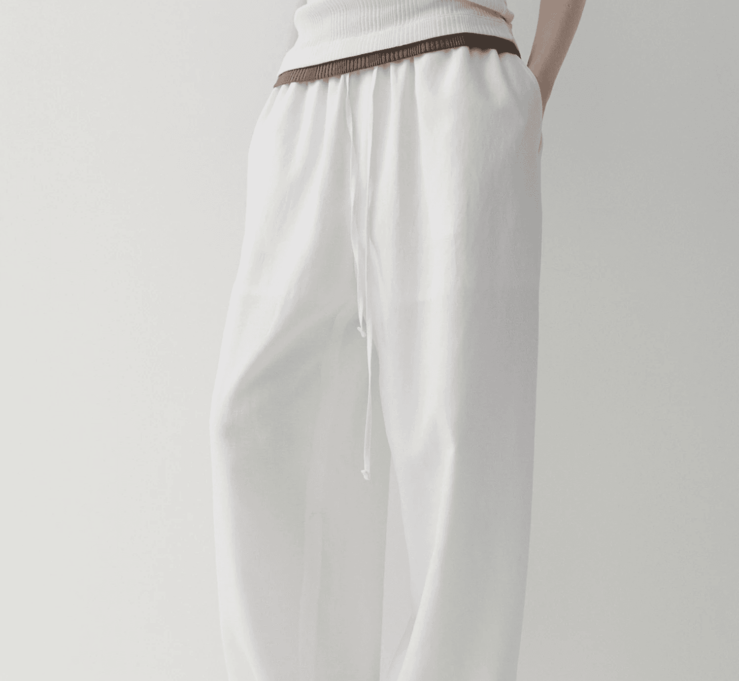 여유롭고 내추럴한 실루엣의 스트링 팬츠입니다. 와이드한 핏으로 여유로운 실루엣을 보여주며, 허리 스트링을 조였을 때 만들어지는 자연스러운 주름이 세련된 분위기를 더합니다.