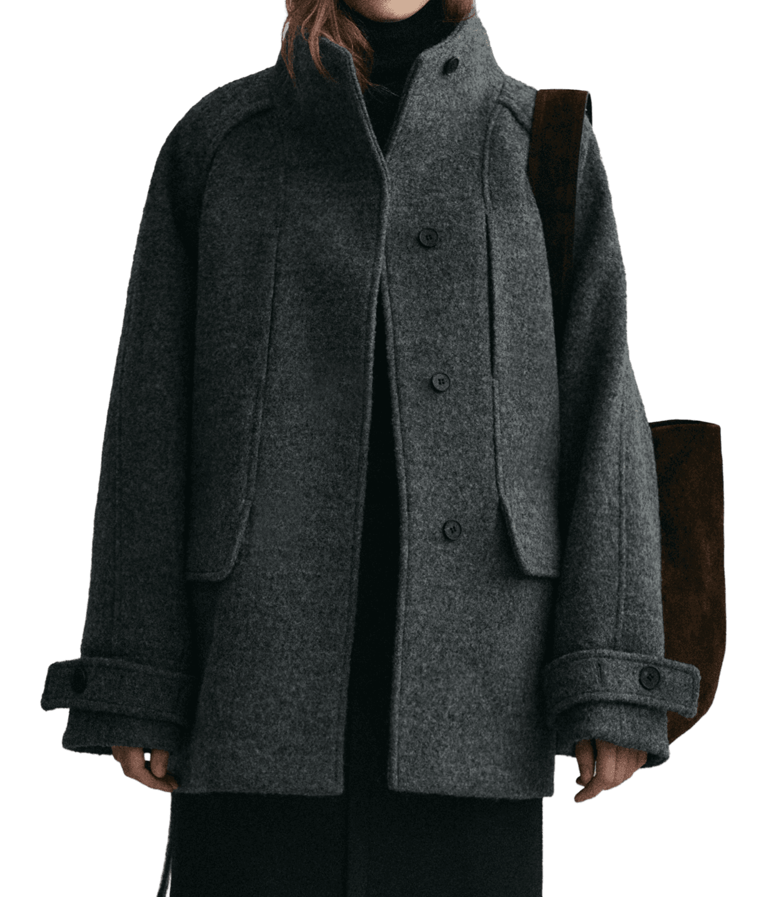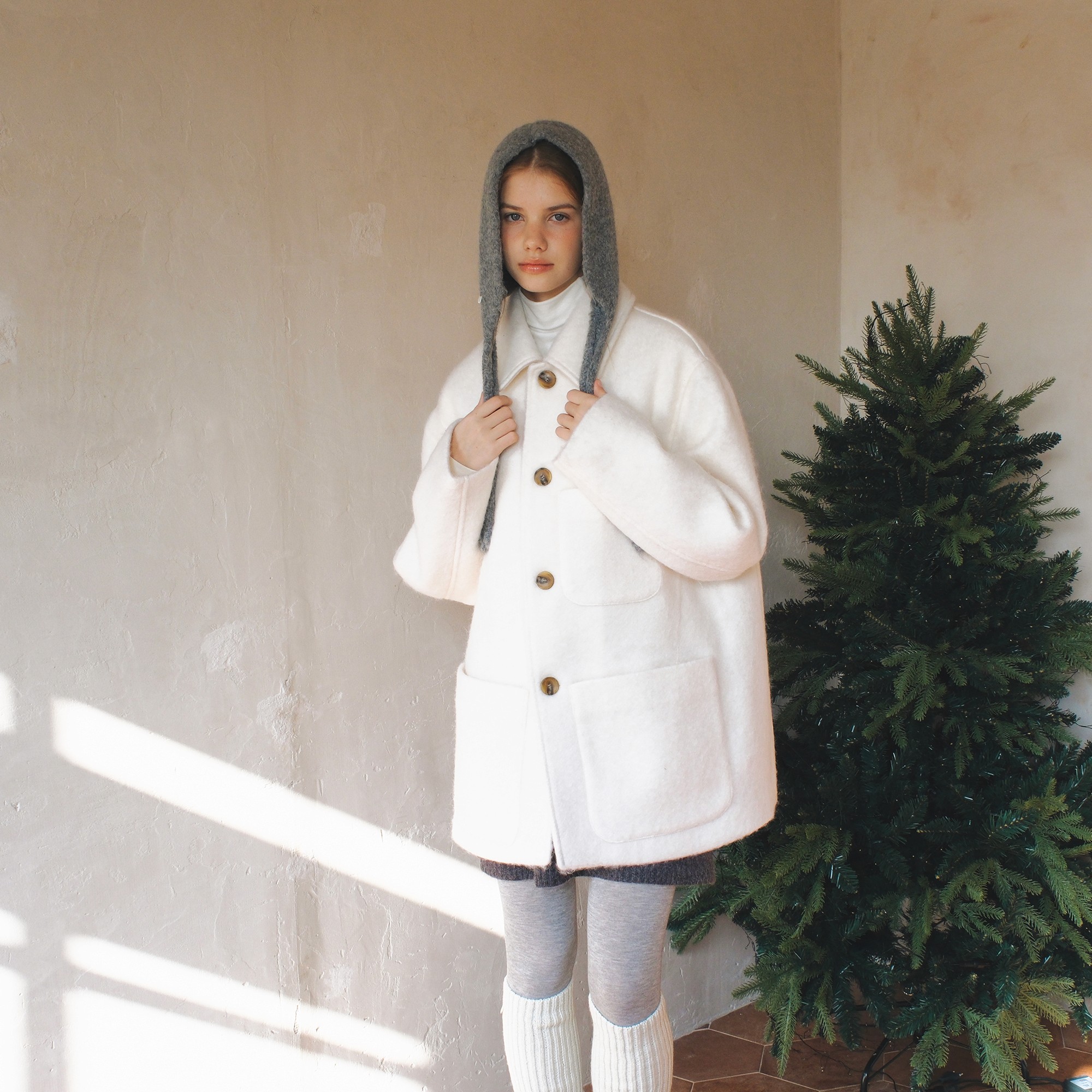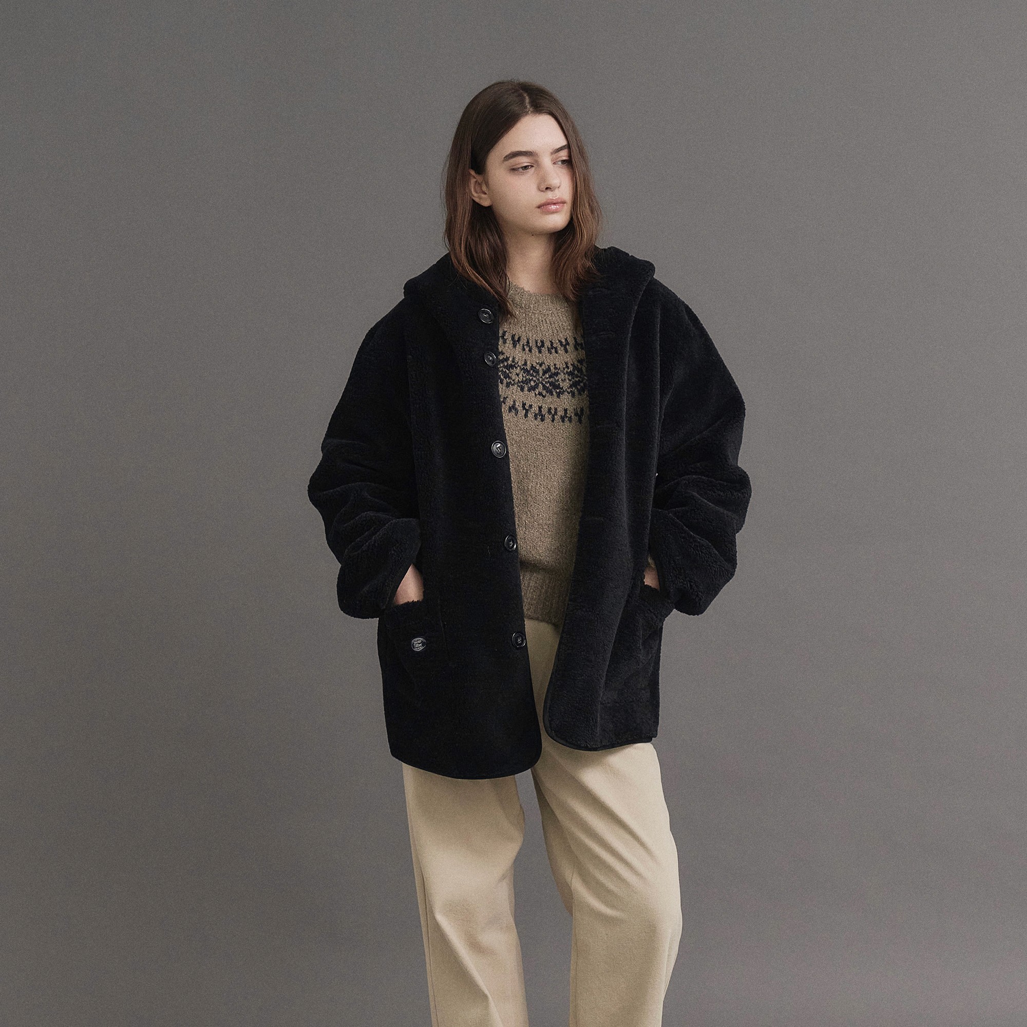 울 원단 특유의 헤어리한 텍스처가 돋보이며 차분한 톤의 컬러가 특징인 매력적인 하프 코트에요.
