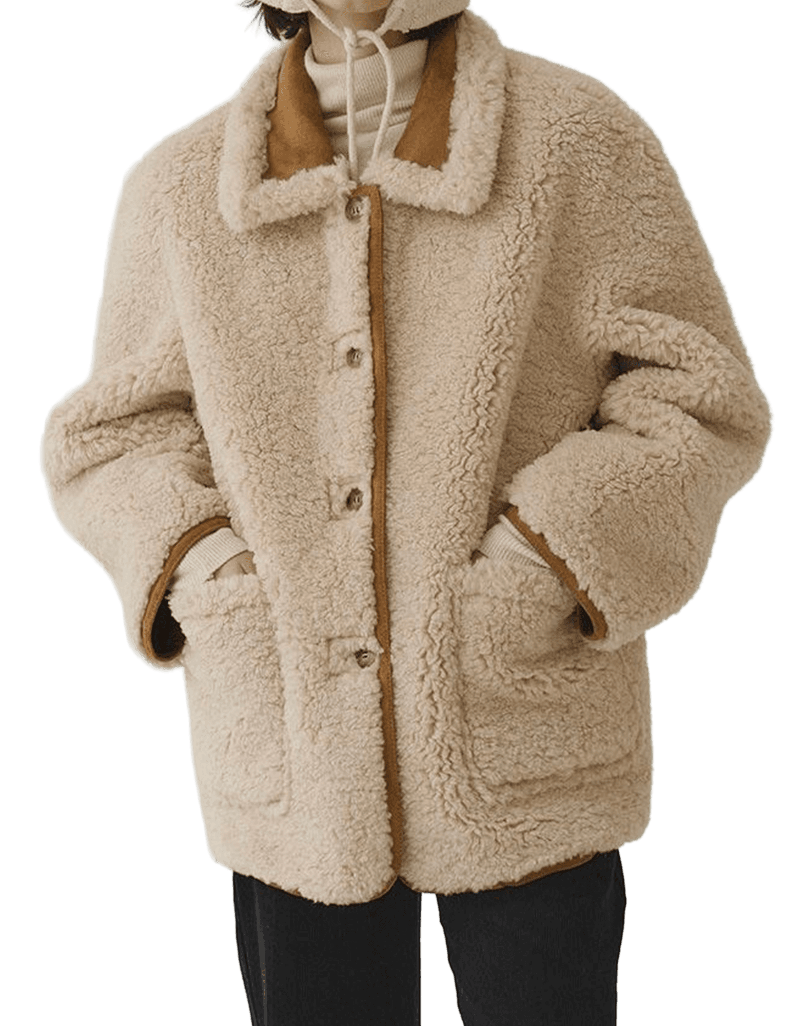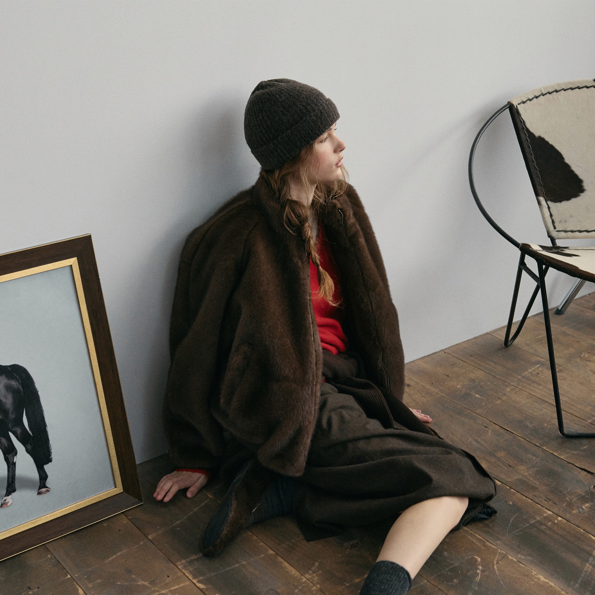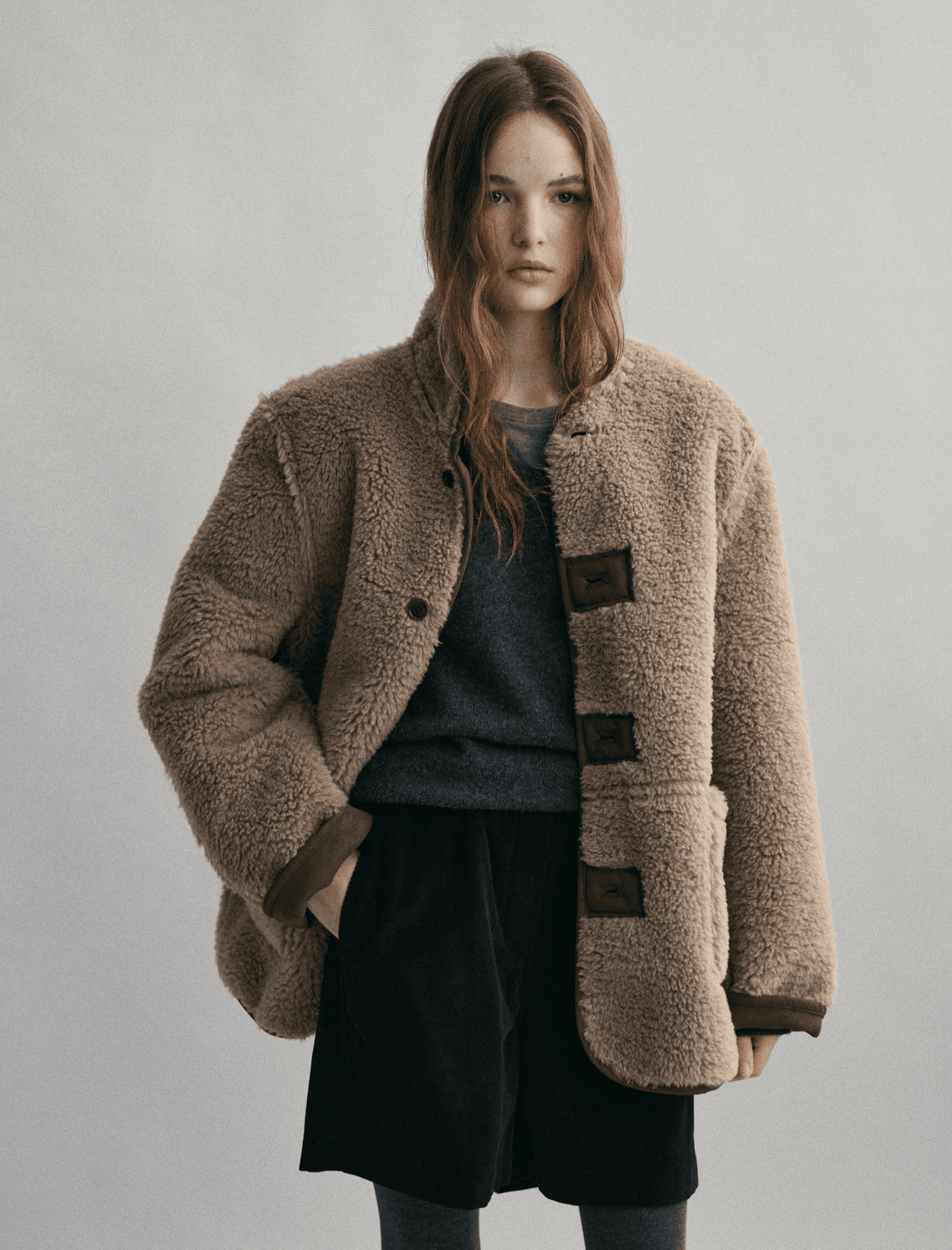 울 원단 특유의 헤어리한 텍스처가 돋보이며 차분한 톤의 컬러가 특징인 매력적인 하프 코트에요.