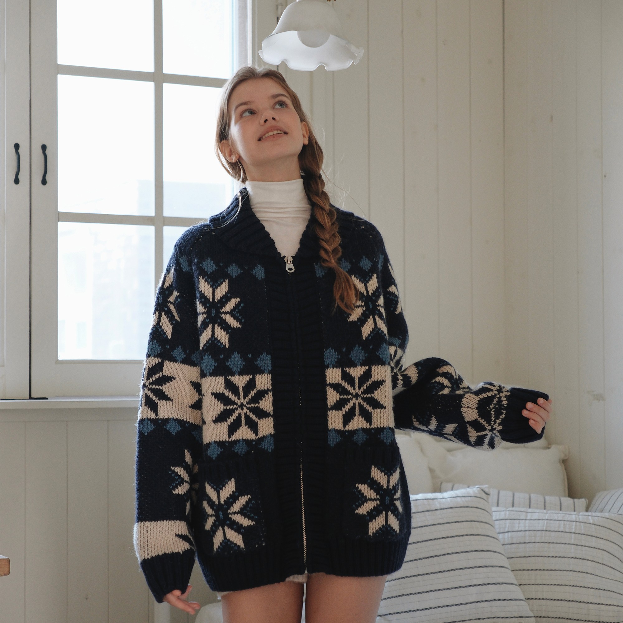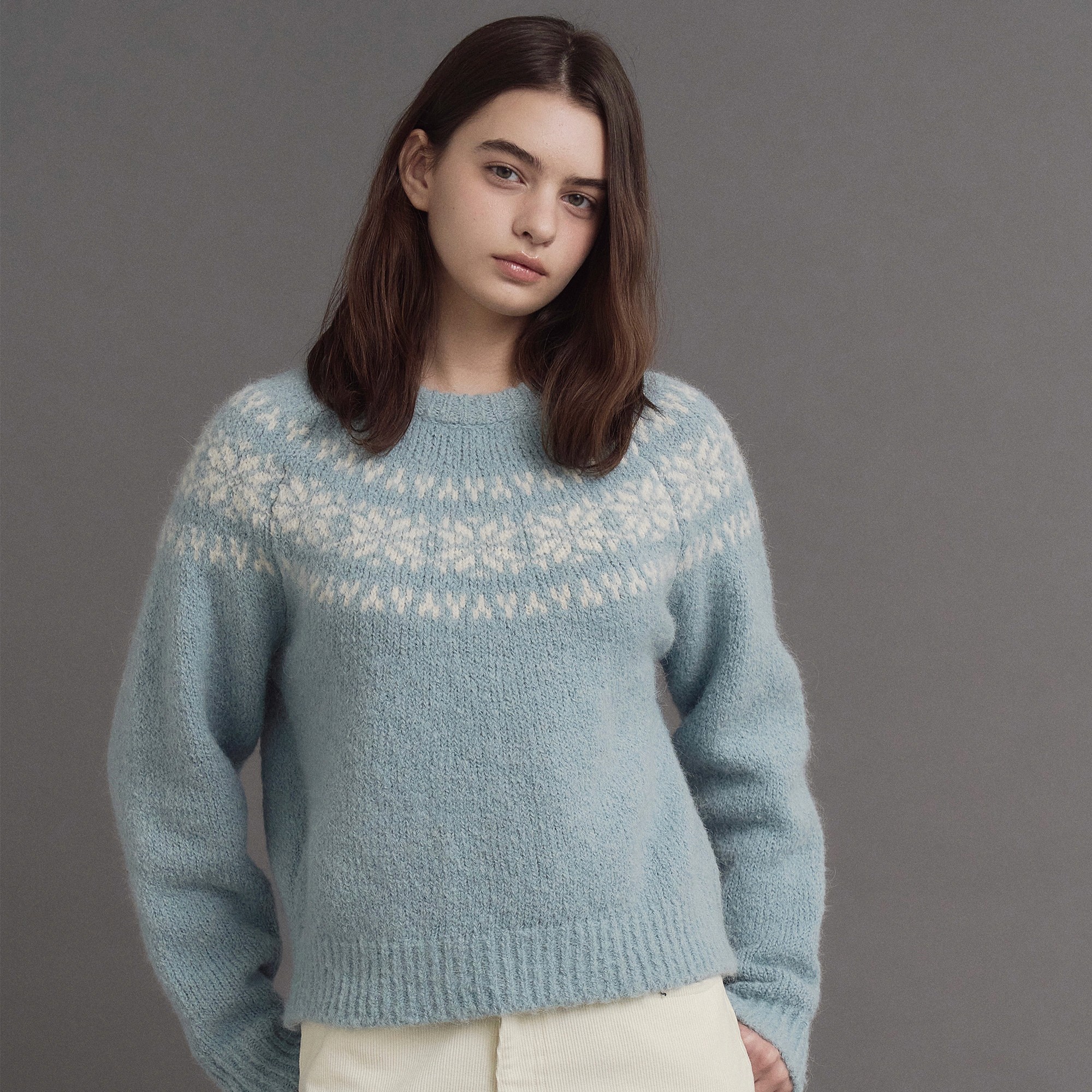 도톰하고 포근한 텍스쳐가 돋보이는 니트로 탄탄한 마감처리와 단정하고 편안한 무드로 다양한 아우터에 레이어드하기 좋아요.