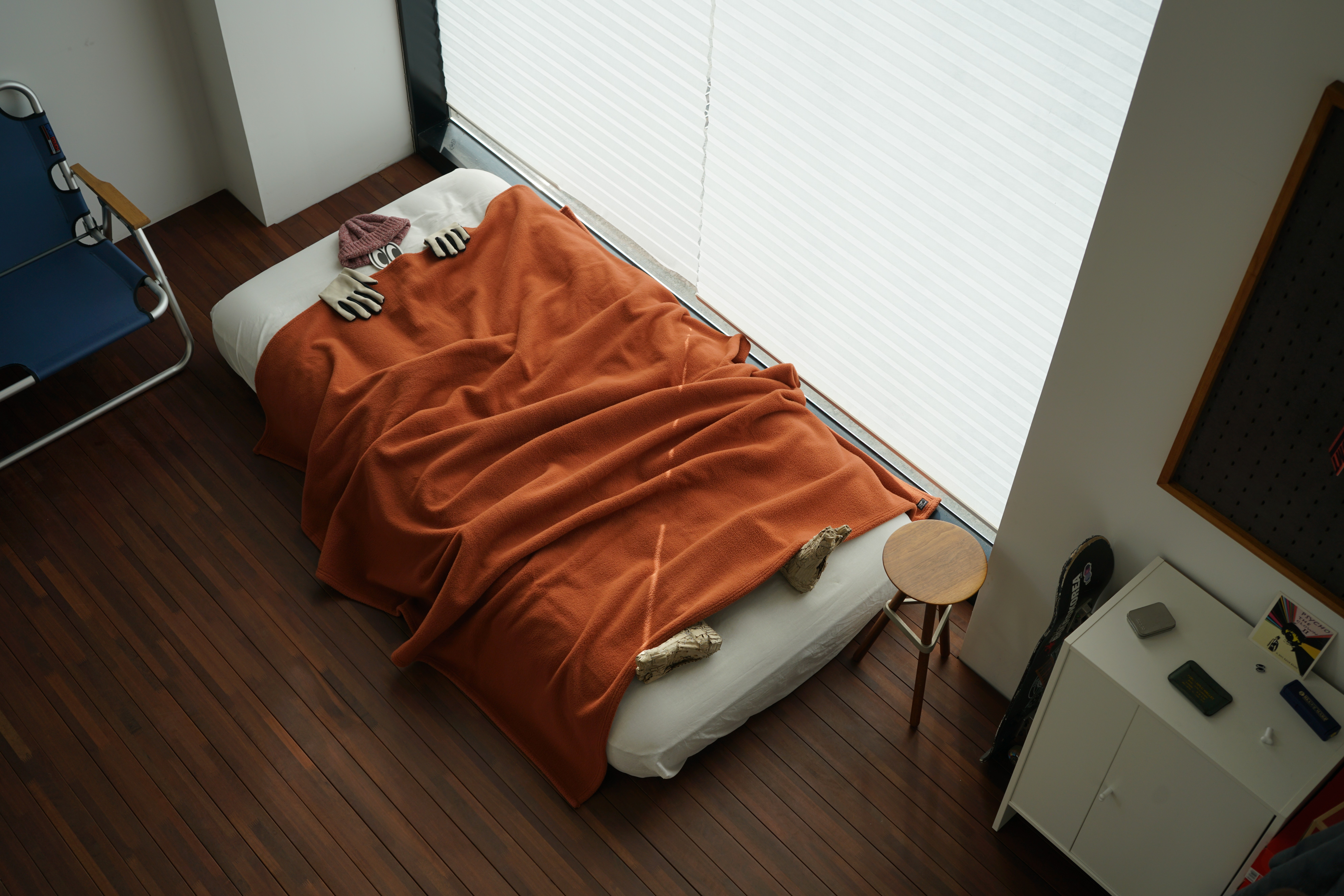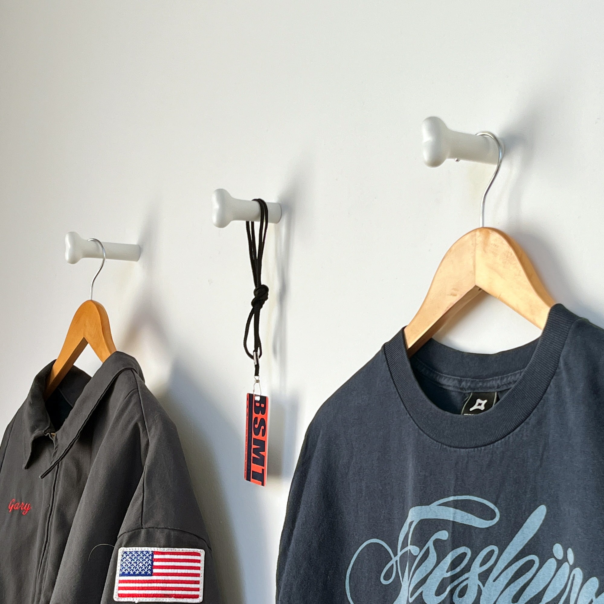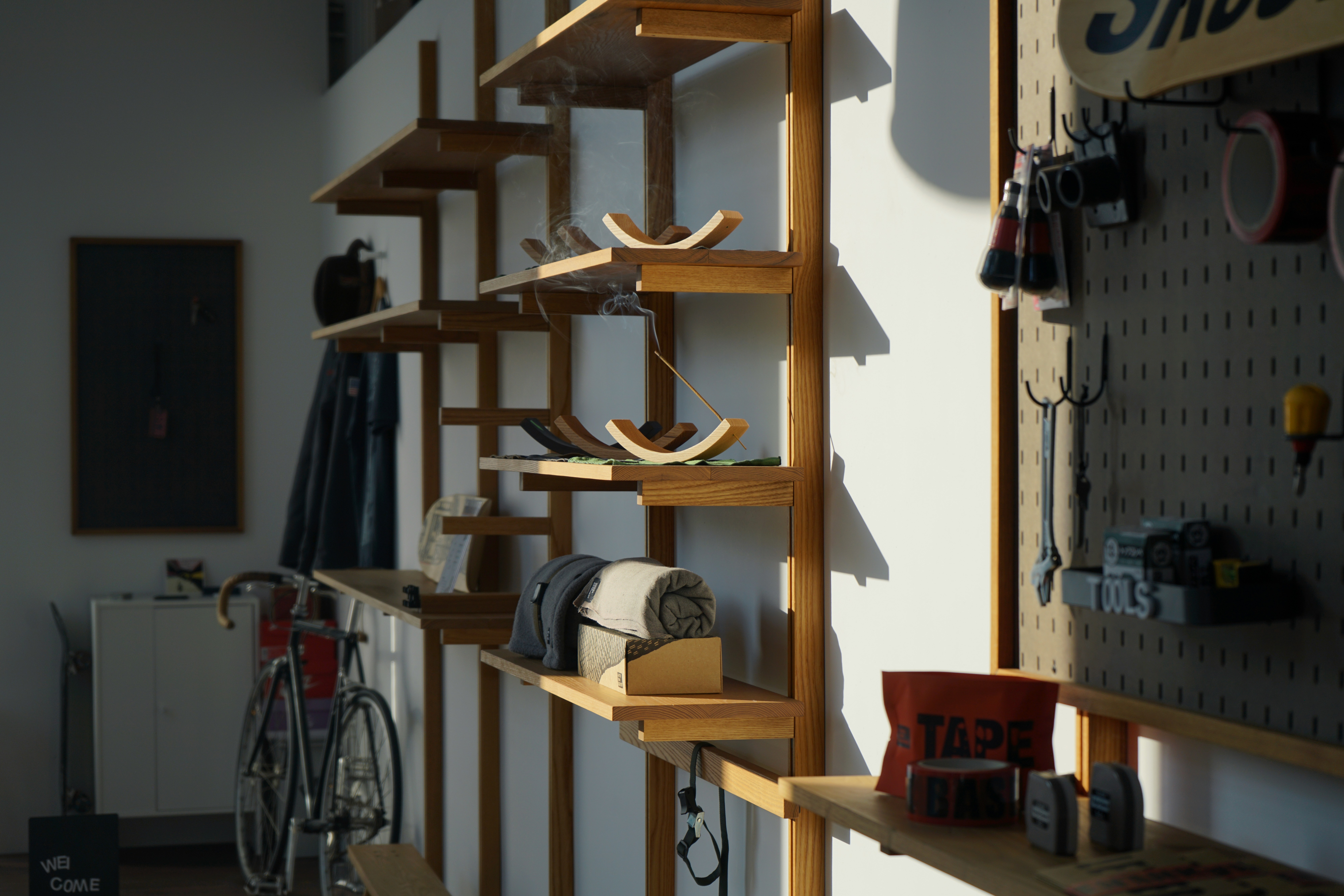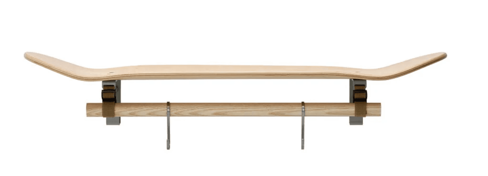 의류와 소품을 정리할 수 있는 선반입니다. 실제 스케이트보드 데크로 만들어져 견고하며, 공간에 포인트가 돼요.