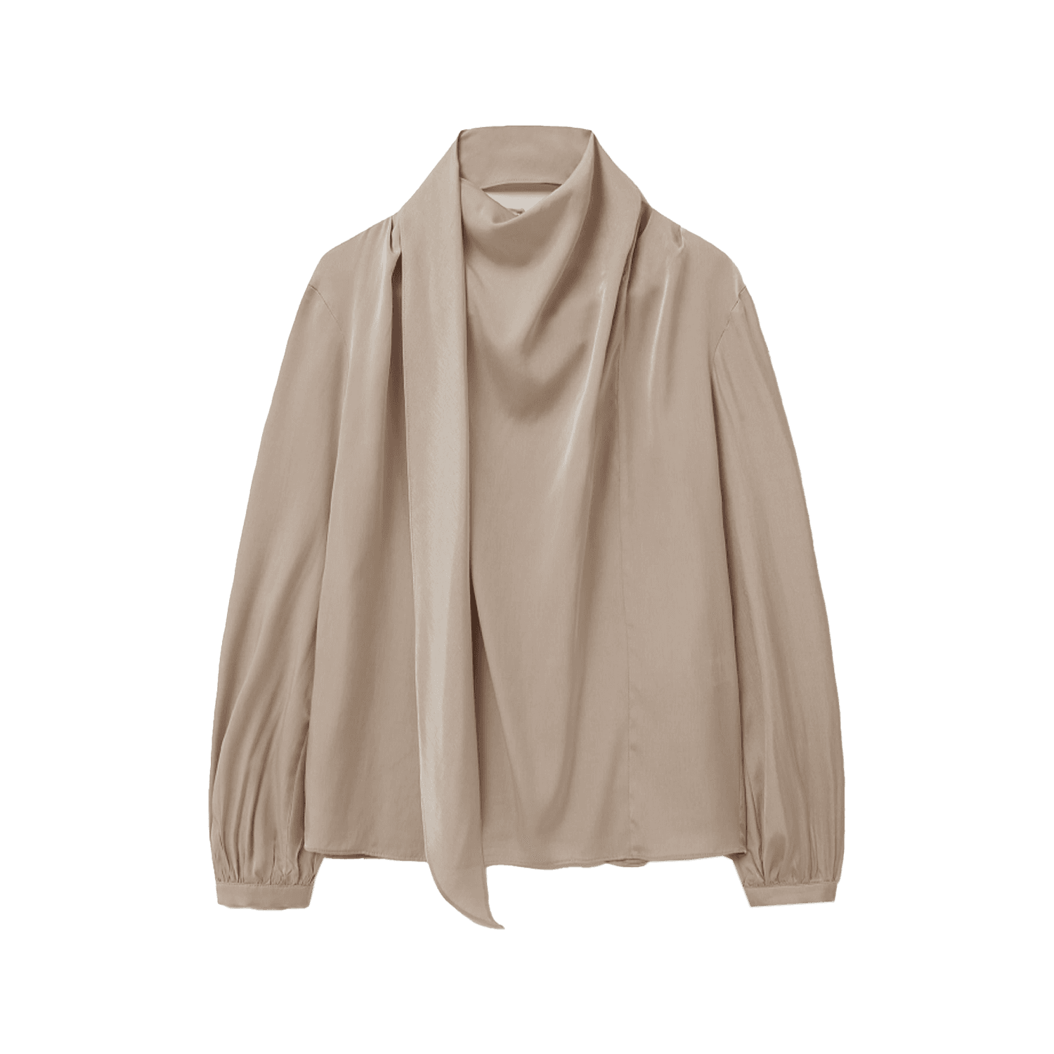 우아한 드레이프 라인이 돋보이는 타이 블라우스입니다.