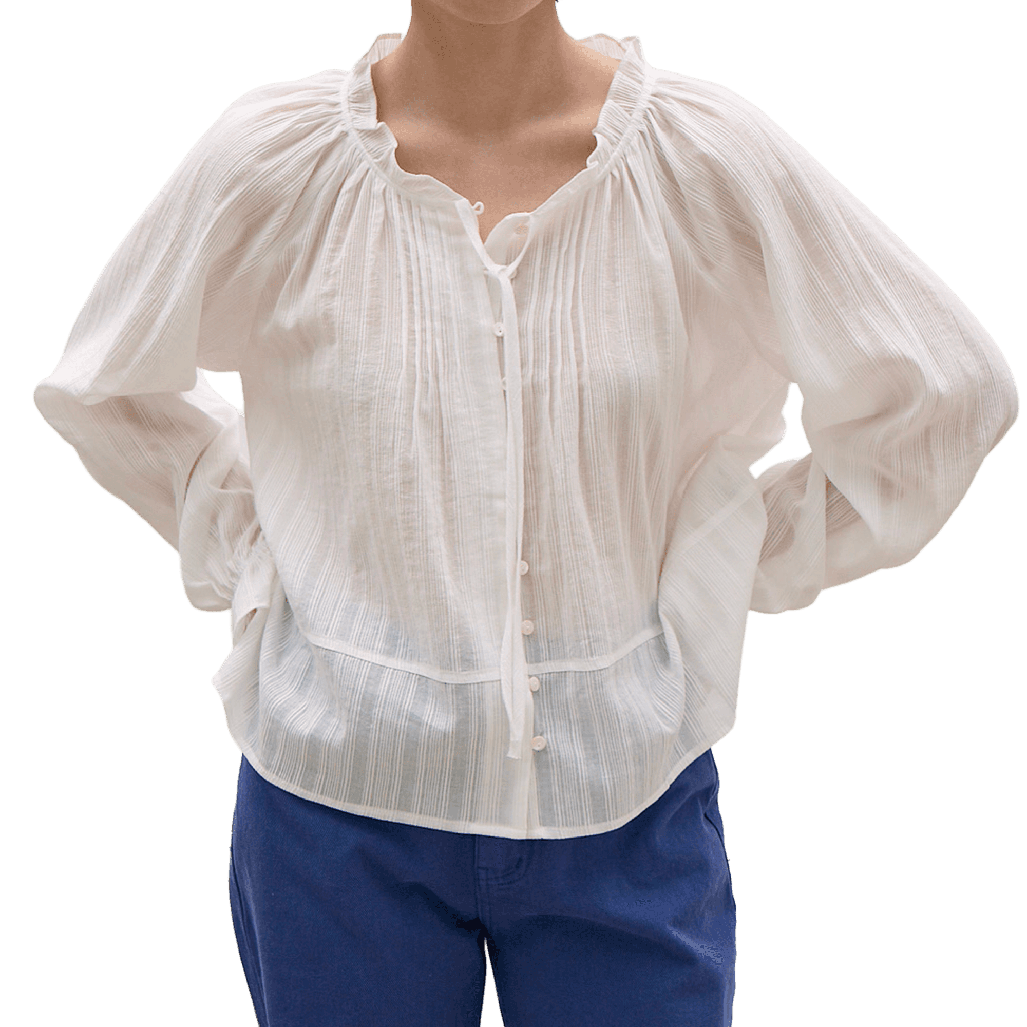 입체적인 텍스처의 원단으로 내추럴하고 고급스러운 무드를 연출하는 블라우스입니다. 프릴과 리본 디테일이 여성스러움을 더해줘요.