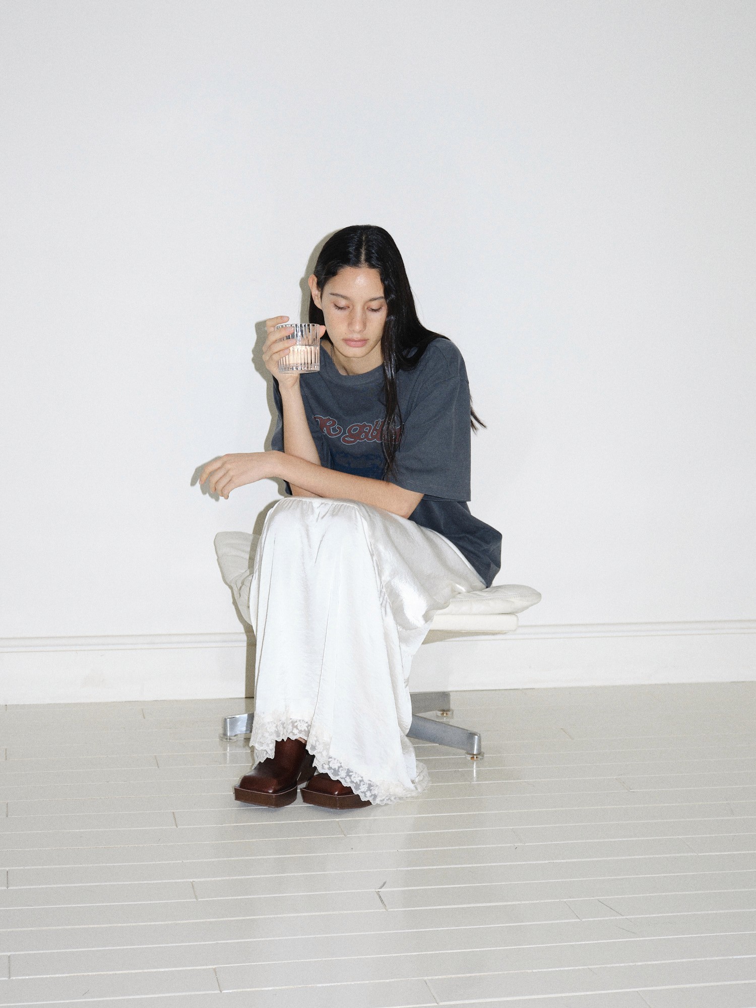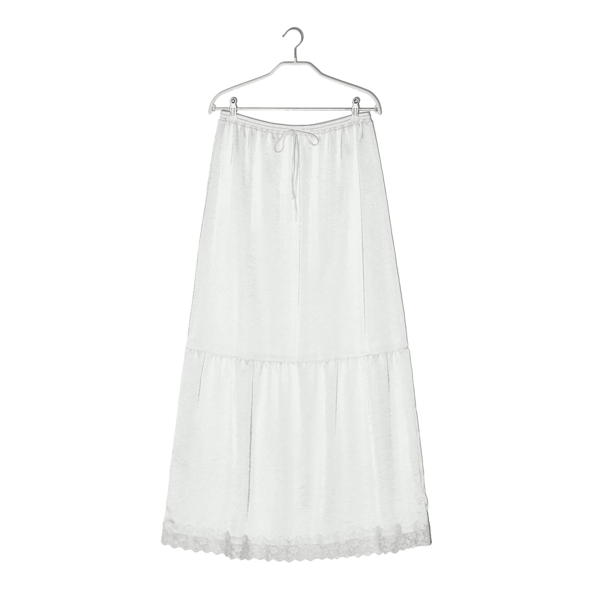 은은하게 흐르는 맥시 새틴 실루엣에 레이스 디테일을 더해, 편안함과 로맨틱 무드를 동시에 담아낸 스커트입니다.