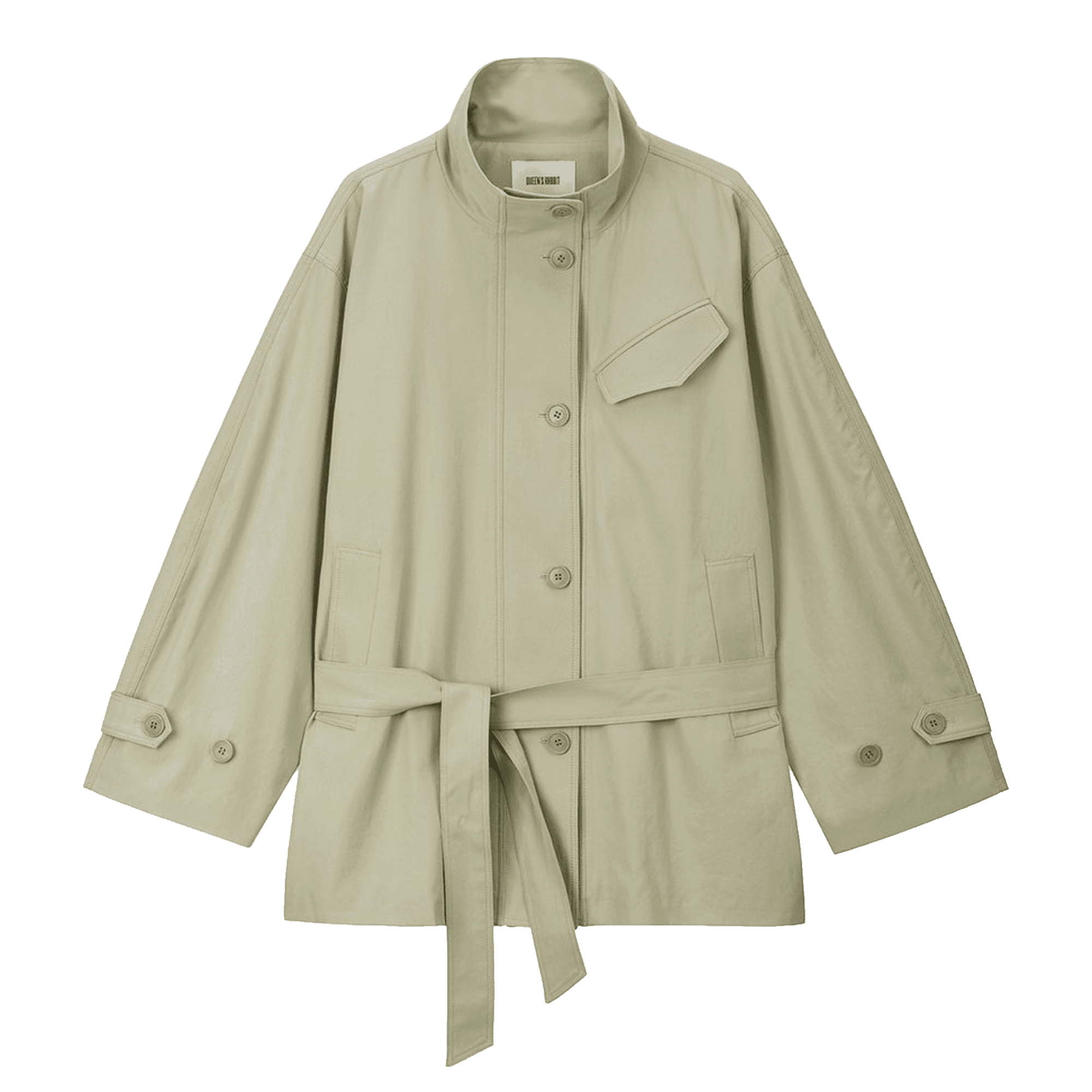 하이넥 카라의 하프 코트로, 로우라이즈 벨트와 버튼 디테일로 볼륨감 있는 실루엣 연출이 가능합니다.