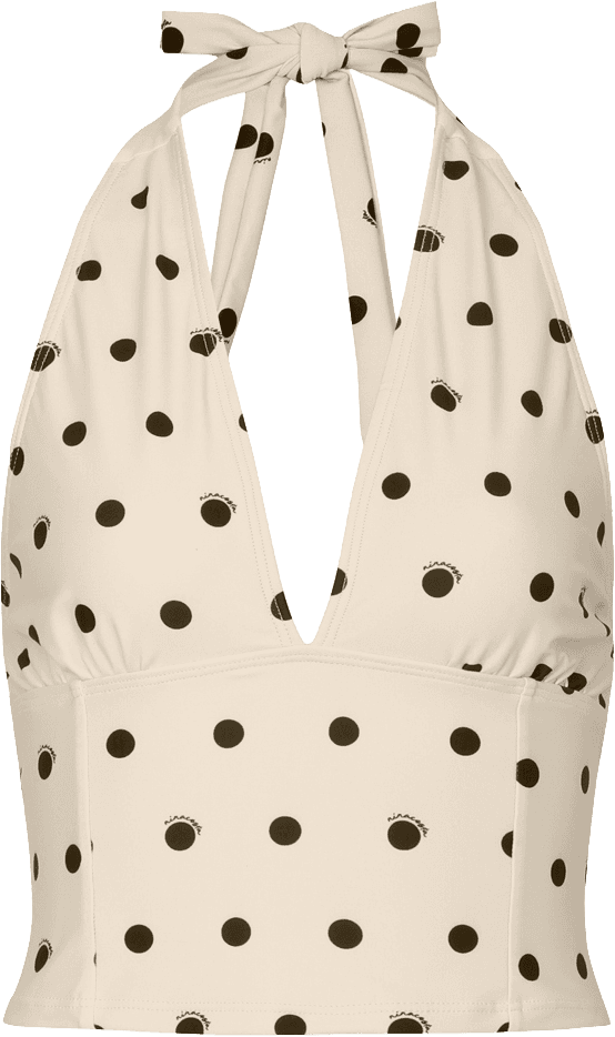 니나코스타의 베스트셀러 도트 홀터 탑은 넉넉한 브라탑 디자인으로 겨드랑이 라인을 자연스럽게 커버하고, 부담 없는 크롭 기장으로 수영복과 휴양지 데일리룩 모두 완성해요.