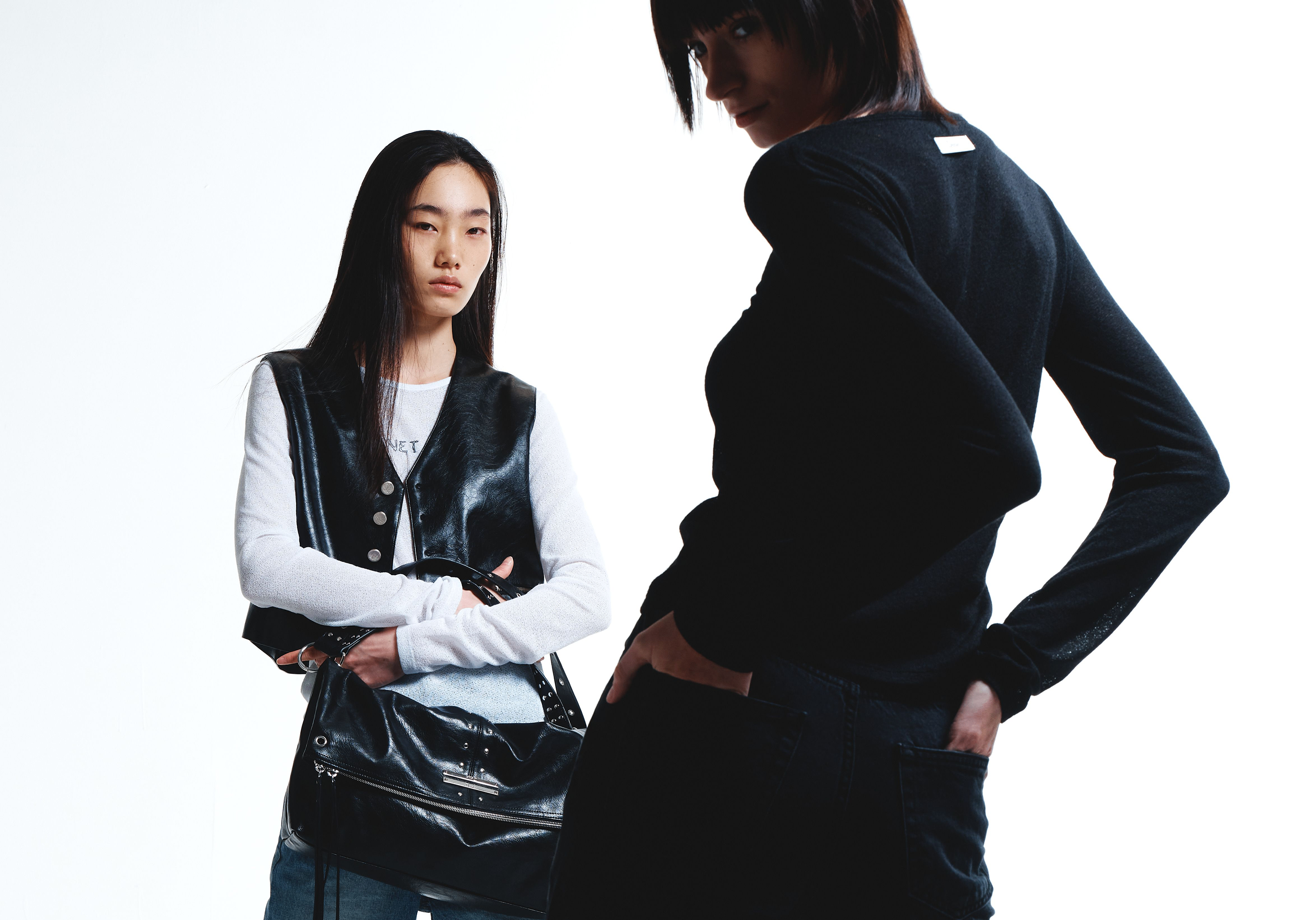 러프한 블루 데님과 블랙 레더, 메탈 디테일이 만드는 시크한 대비. 절제된 실루엣만으로 완성되는 강한 인상을 만나보세요.