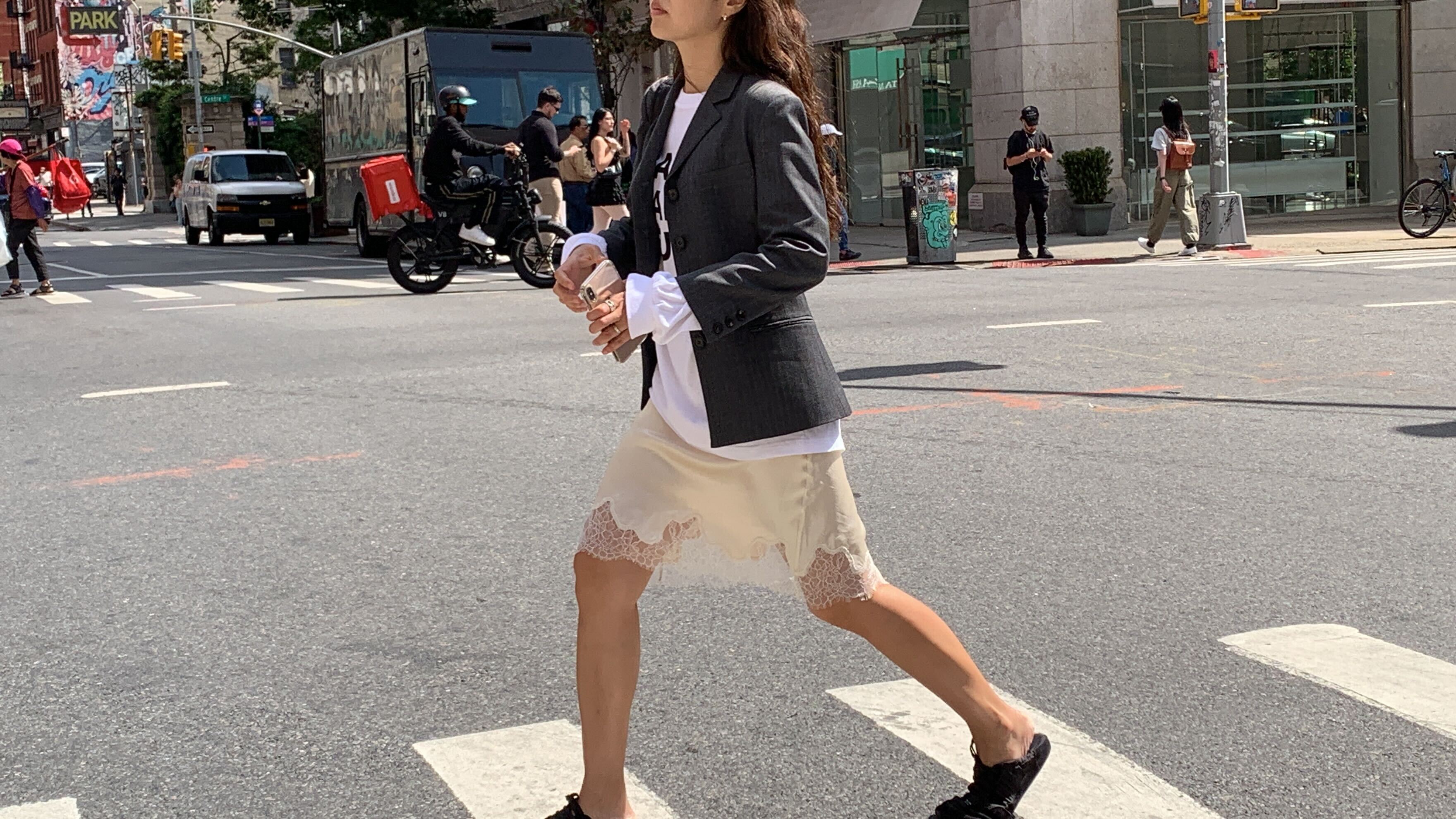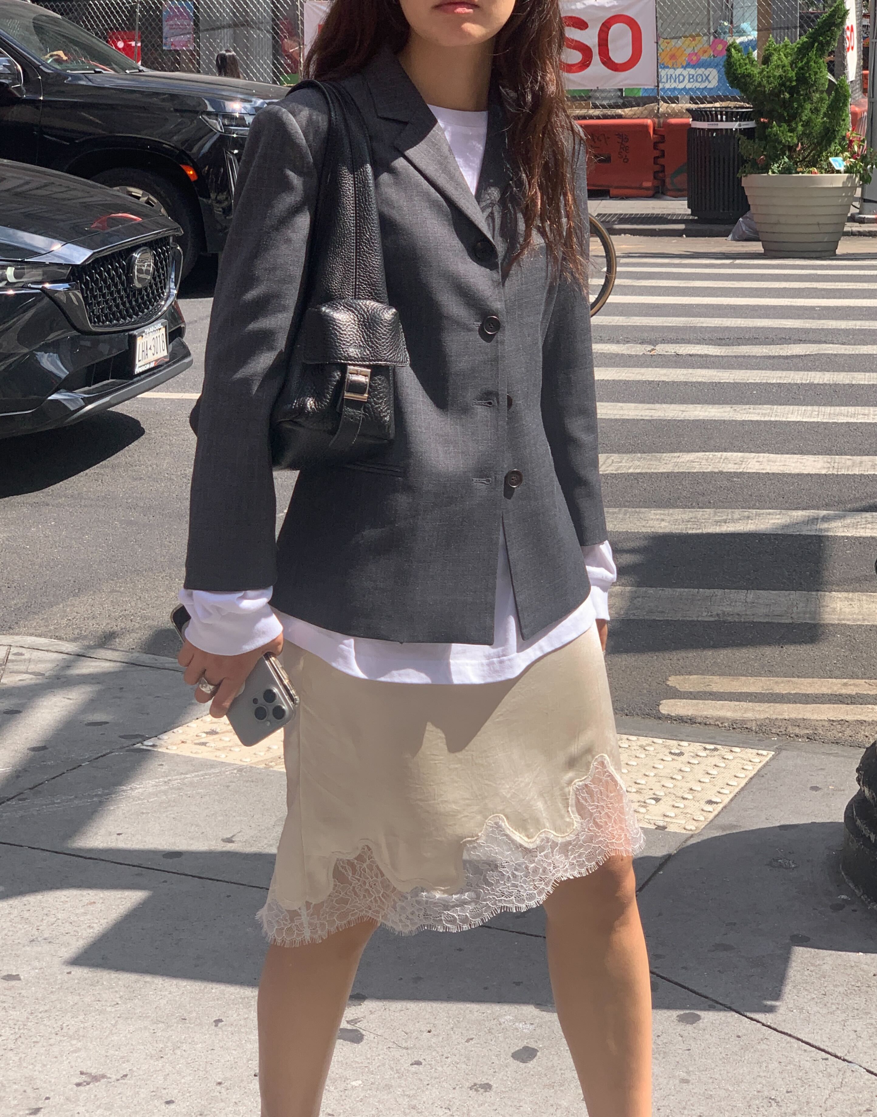 후드나 데님처럼 일상적이고 편안한 아이템과 레이어드해서 캐주얼하게 입었을 때 의외의 즐거움을 주는 믹스 매치로 활용해 보세요.