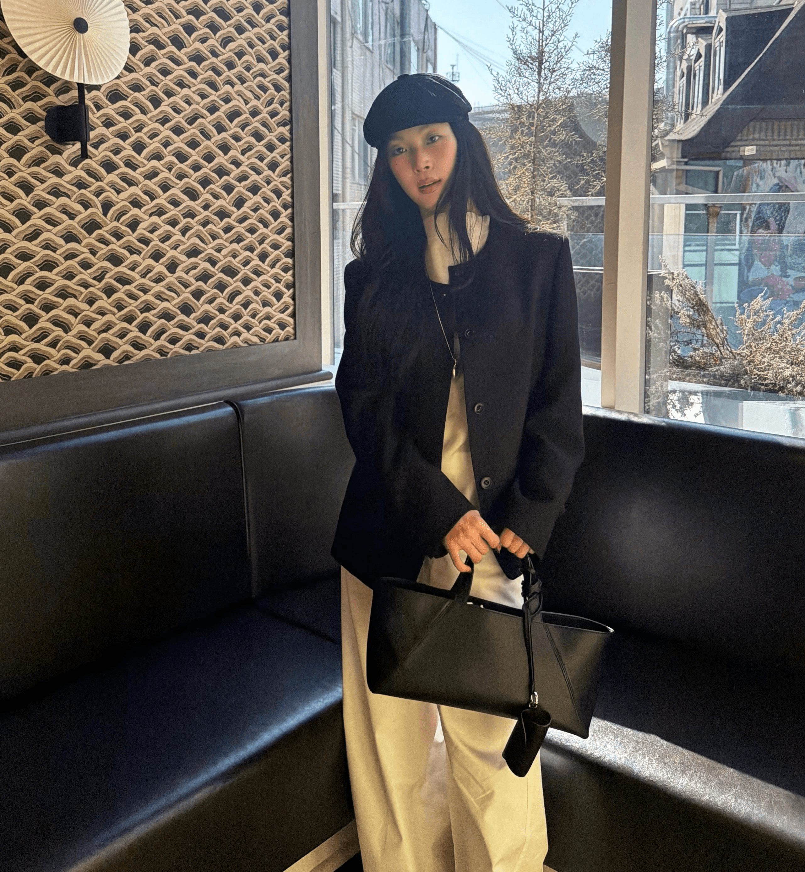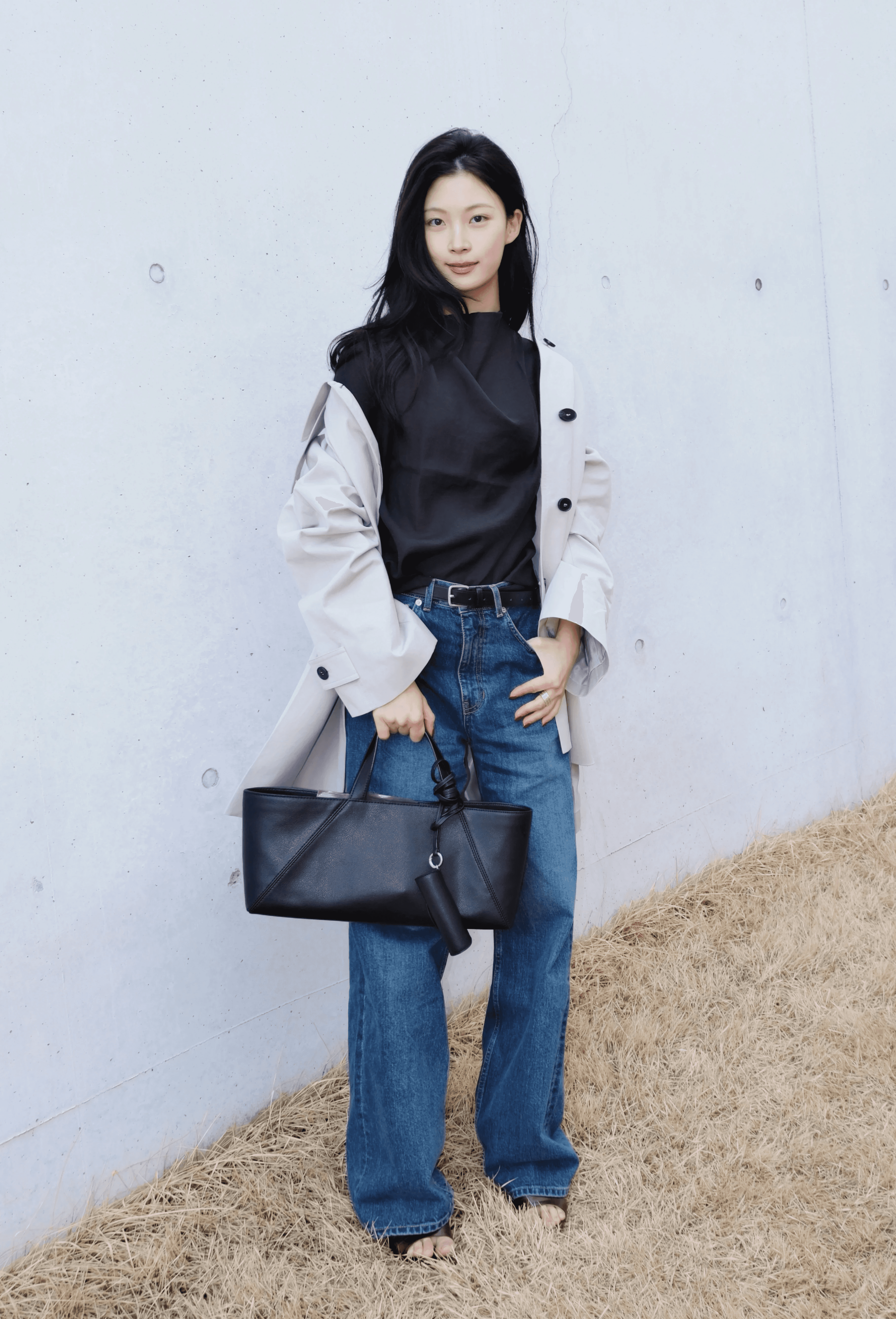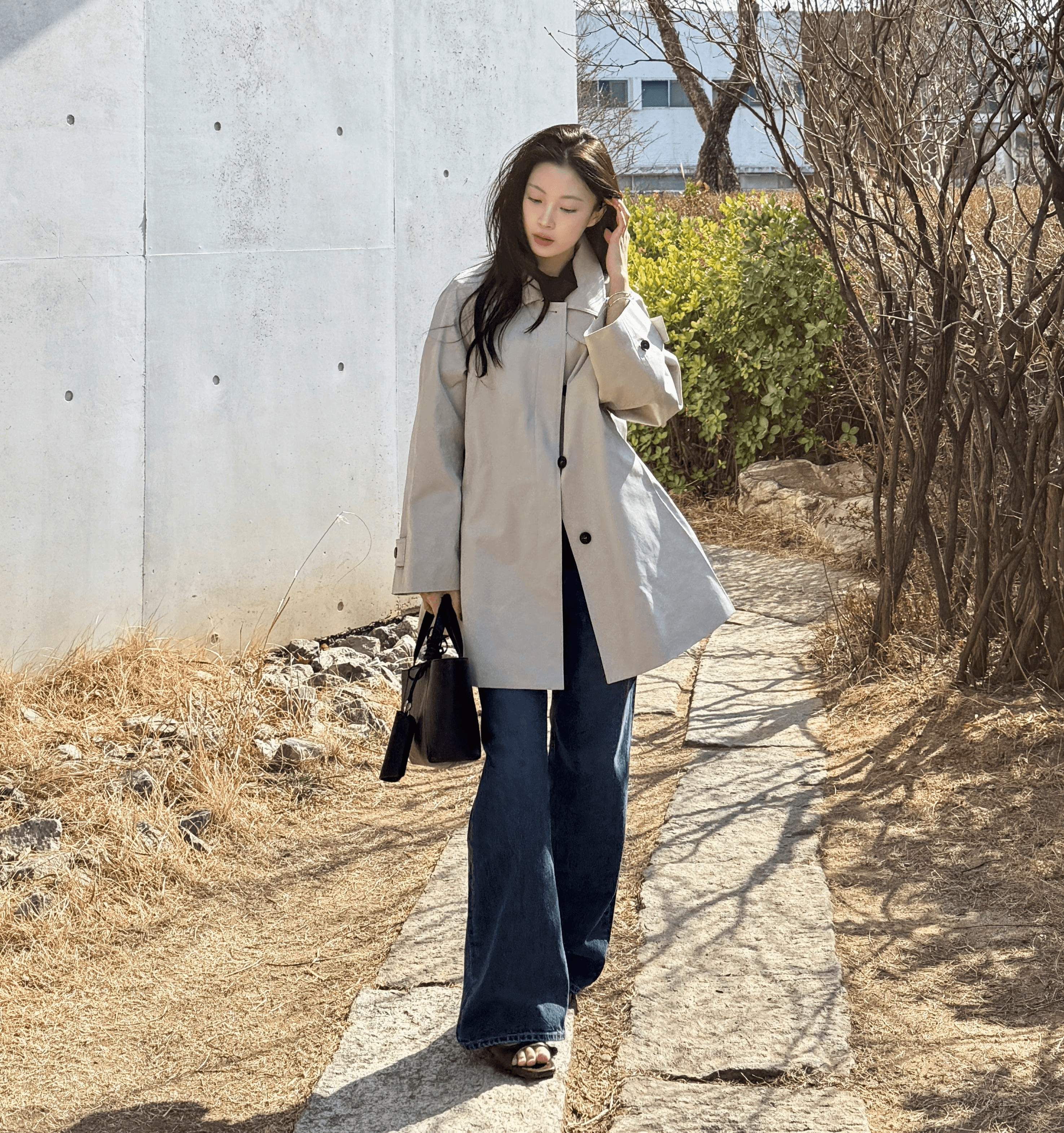 셔링 디테일이 돋보이는 상의와 클래식한 데님을 조합해 단정함과 캐주얼의 균형을 맞췄습니다. 래글런 소매의 하프 코트가 전체적인 룩에 풍성한 볼륨을 더해주어, 활동적이면서 정돈된 아웃핏을 보여줍니다.