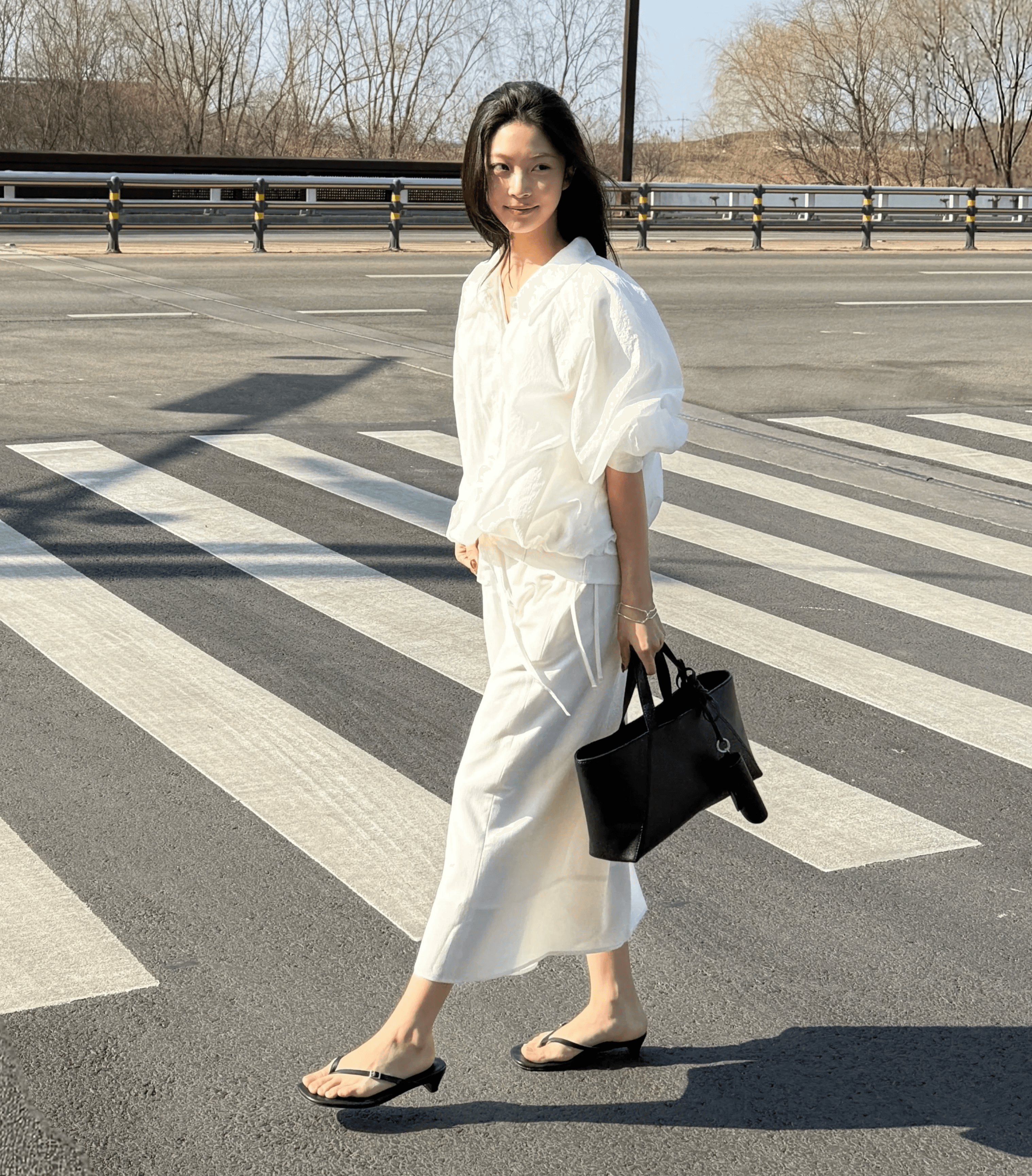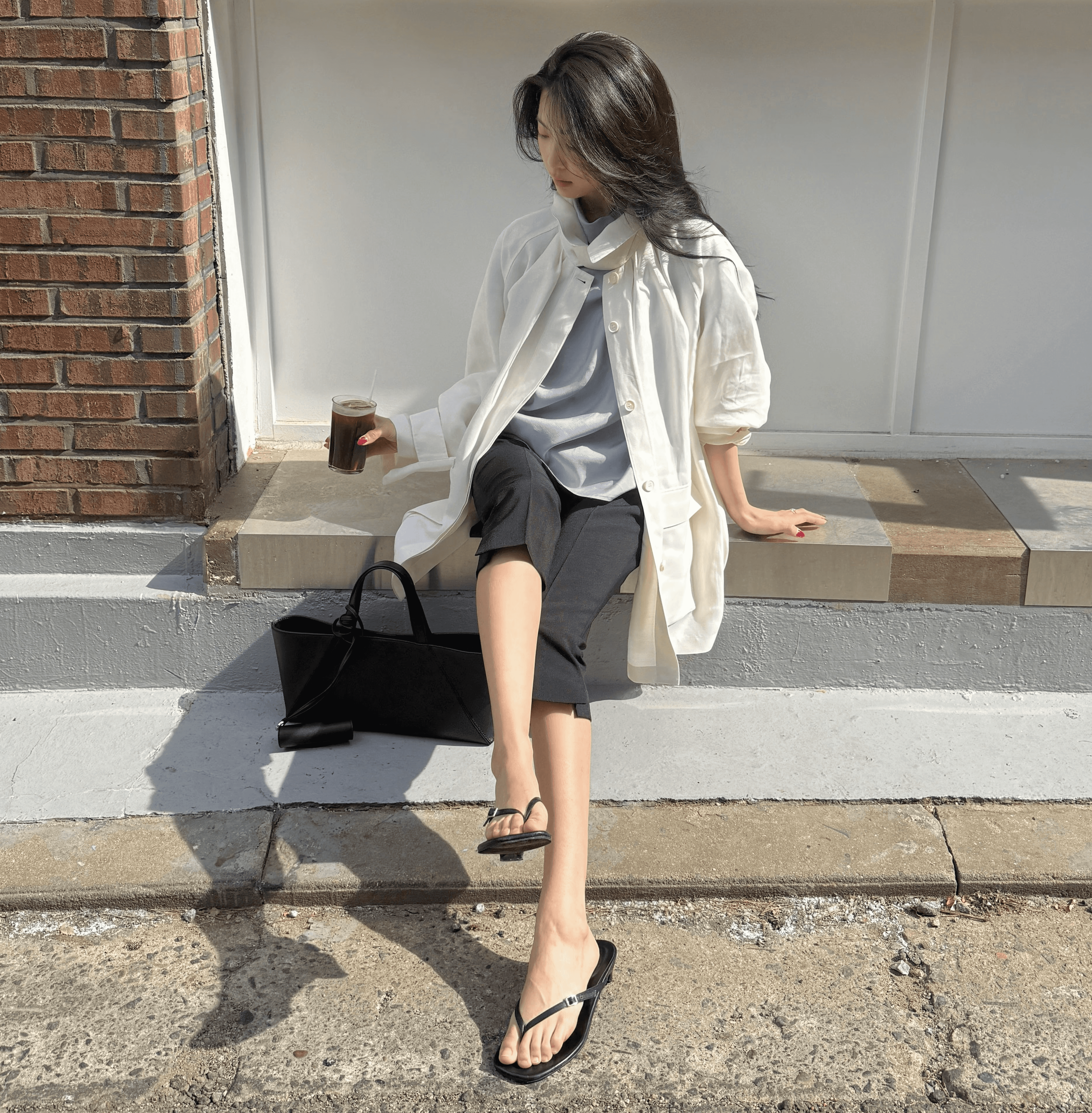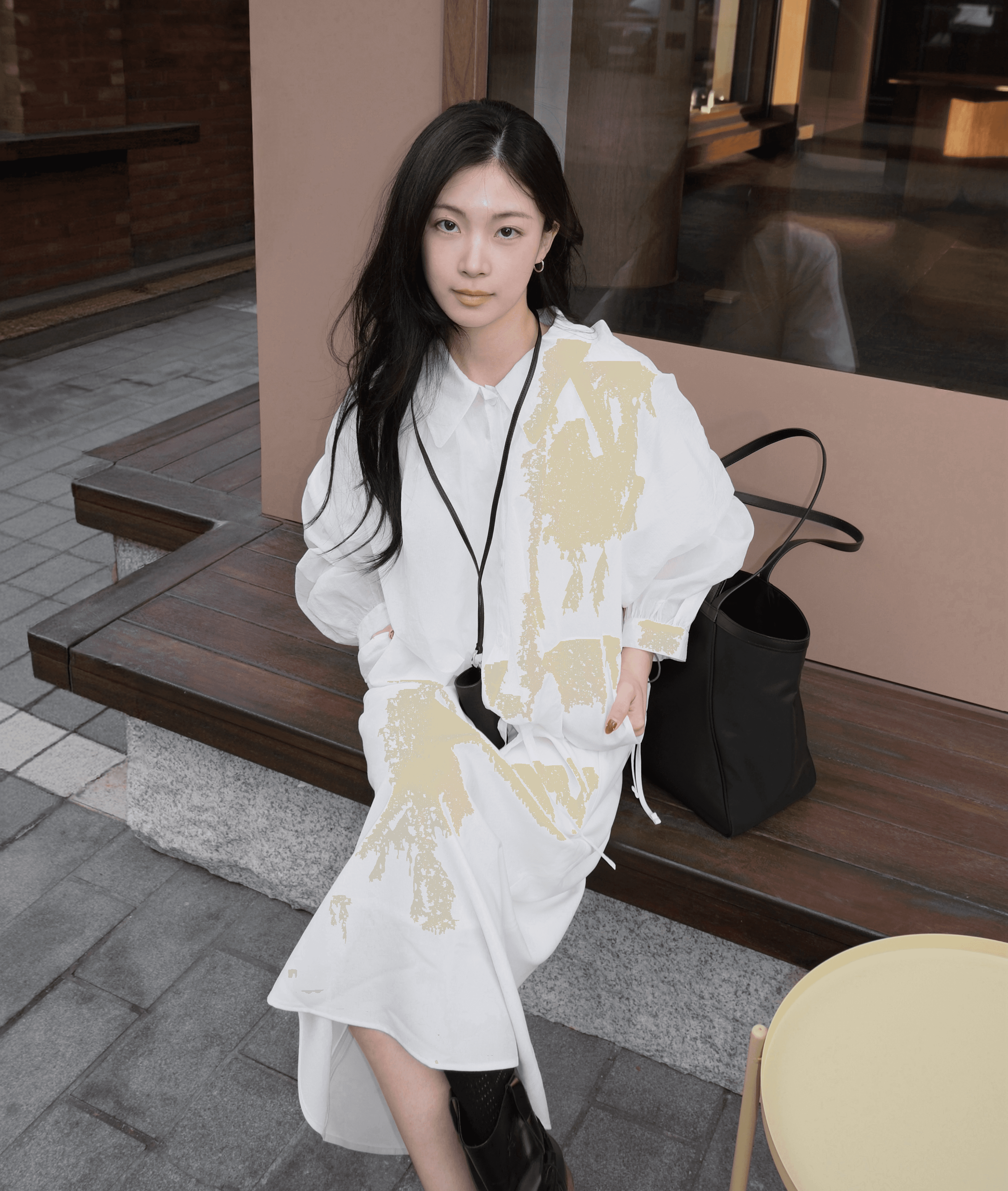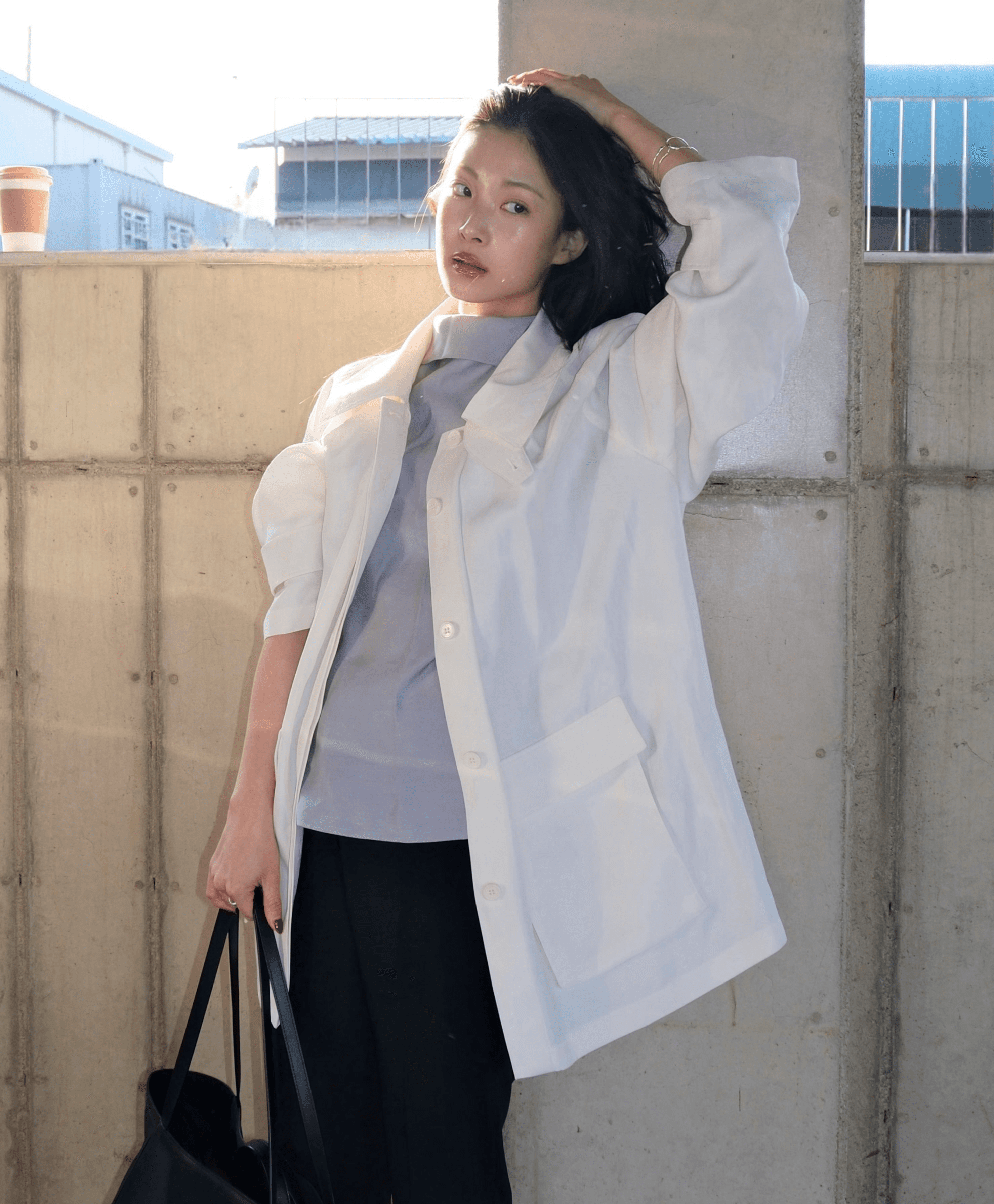 은은하게 비치는 화이트 톤의 셔츠재킷과 플랩 디테일의 미디스커트로 맑고 깨끗한 분위기를 강조했어요. 미니멀한 톤온톤 스타일링 위에 구조적인 립스틱 백을 액세서리로 더해, 위트 있는 디테일을 완성했습니다.