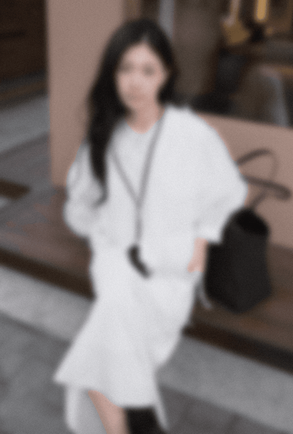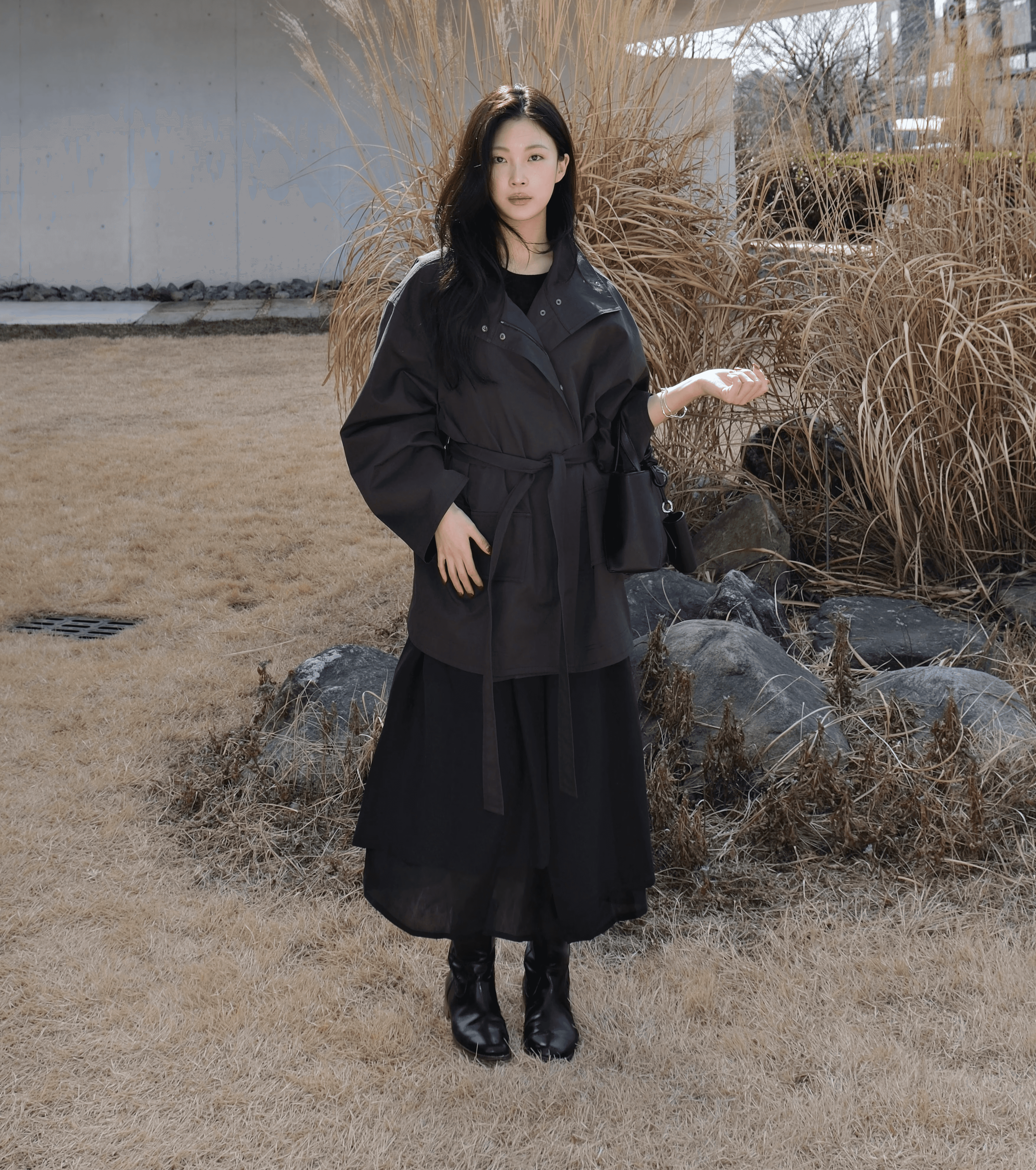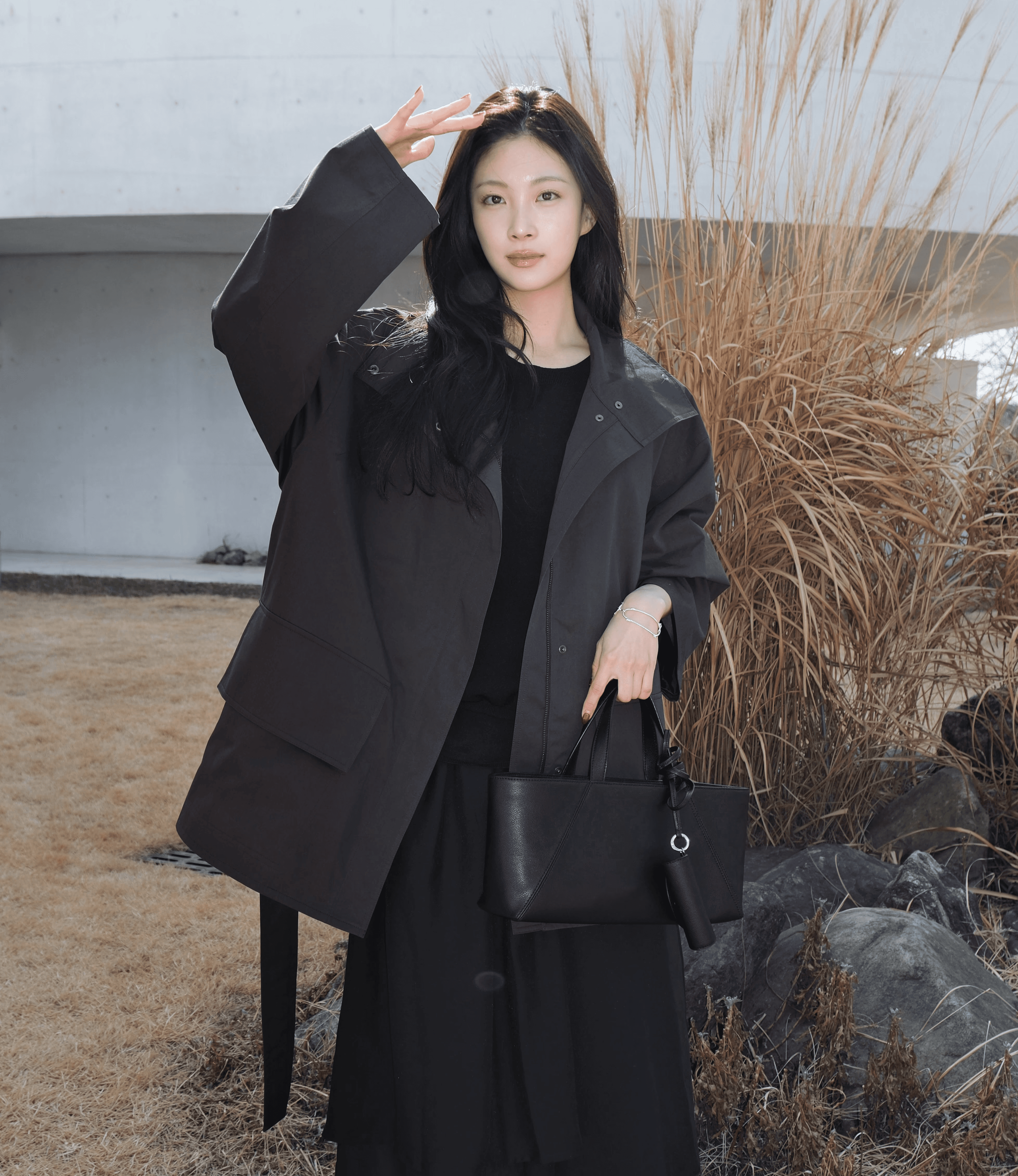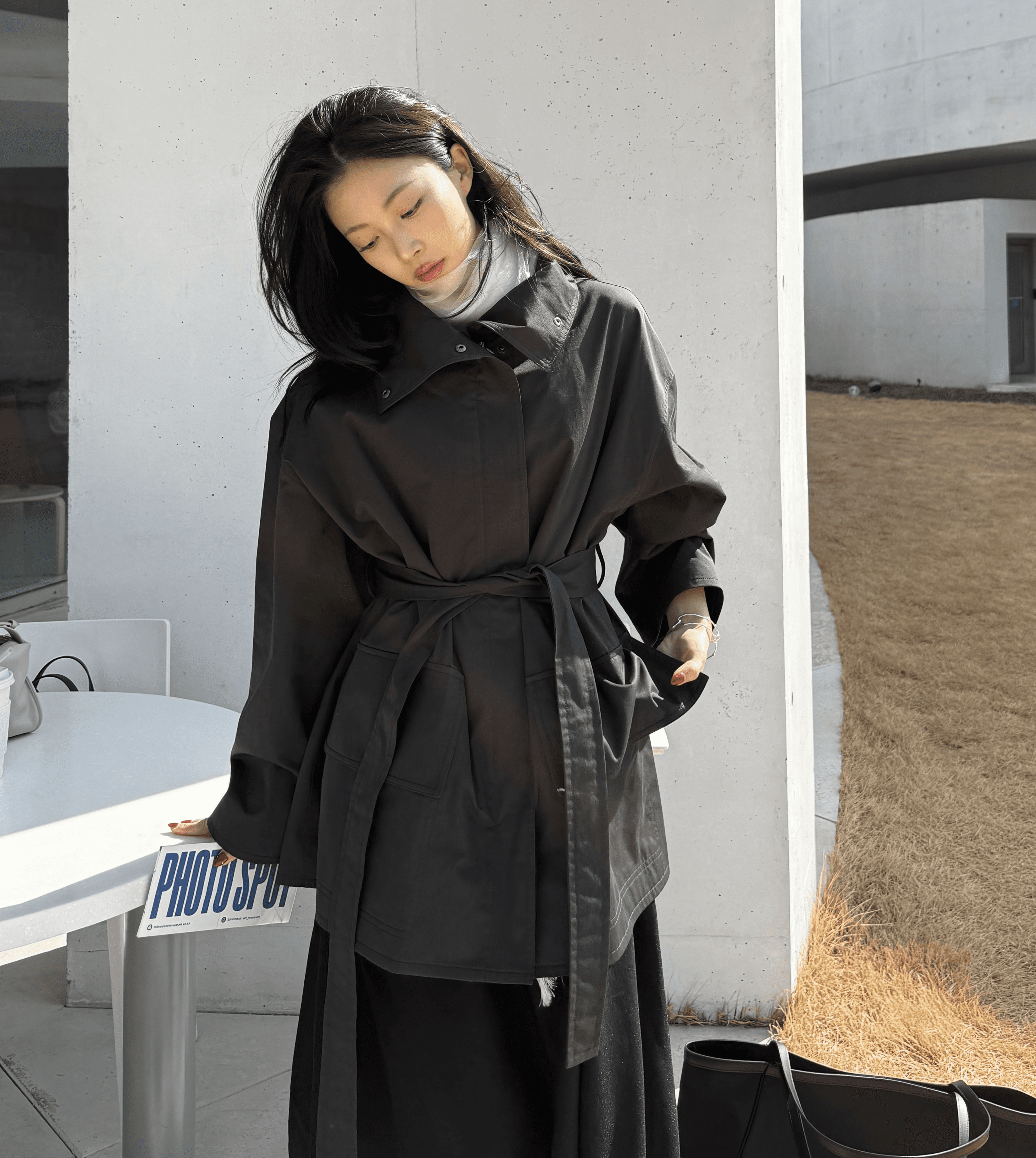 볼드한 하이넥 재킷과 풍성한 셔링이 돋보이는 시어 원피스를 매치해 실루엣의 변화를 주었어요. 매트한 아우터와 비치는 소재의 질감 대비가 조화를 이루어, 일상 속에서도 시선을 사로잡는 무드를 연출합니다.