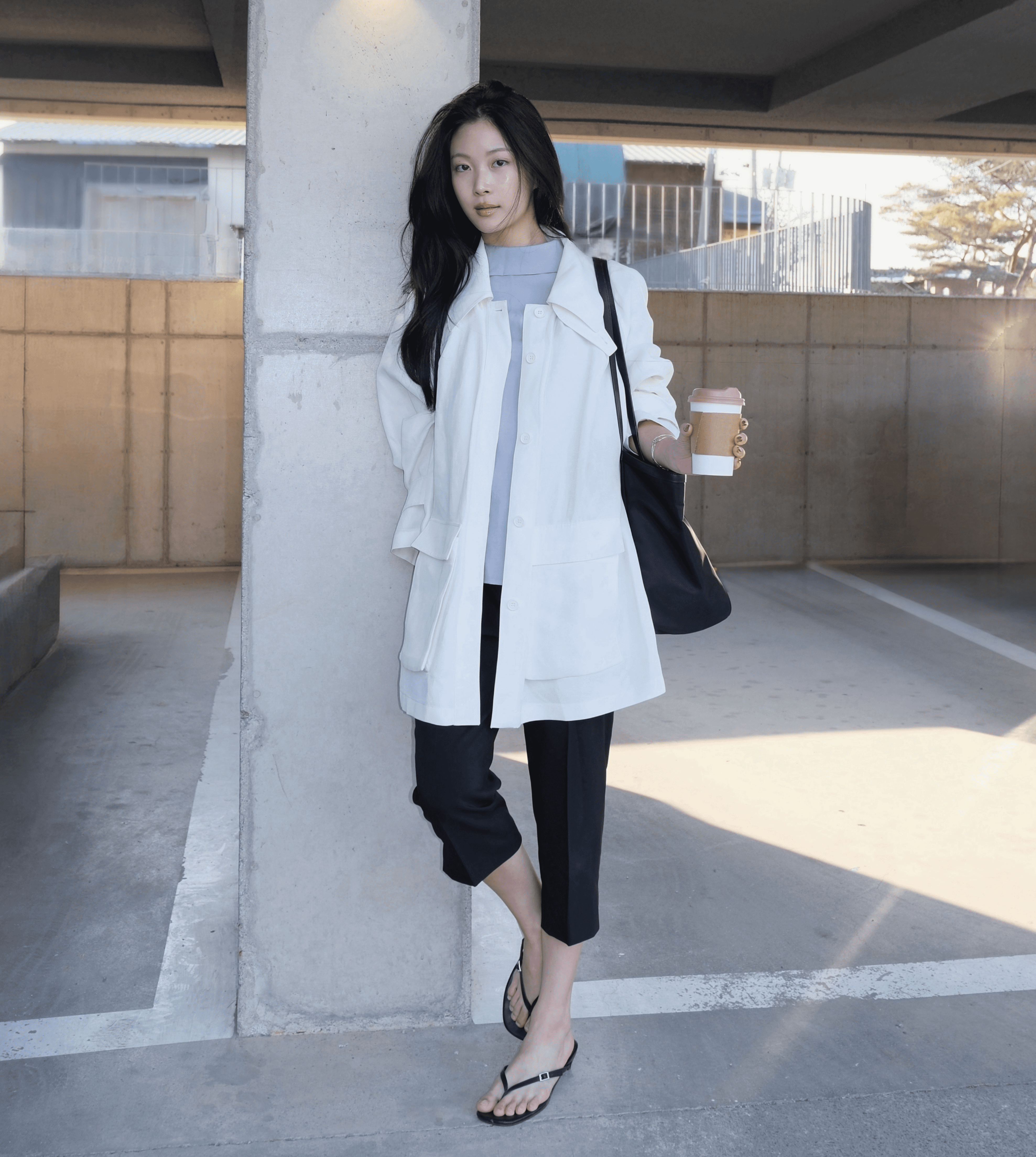 입체적인 볼륨감의 유틸리티 재킷과 절제된 디자인의 카프리 팬츠를 매치해 도시적인 룩을 완성했어요. 재킷의 구조적인 포인트와 팬츠의 정교한 테일러링으로 세련된 분위기를 연출합니다.