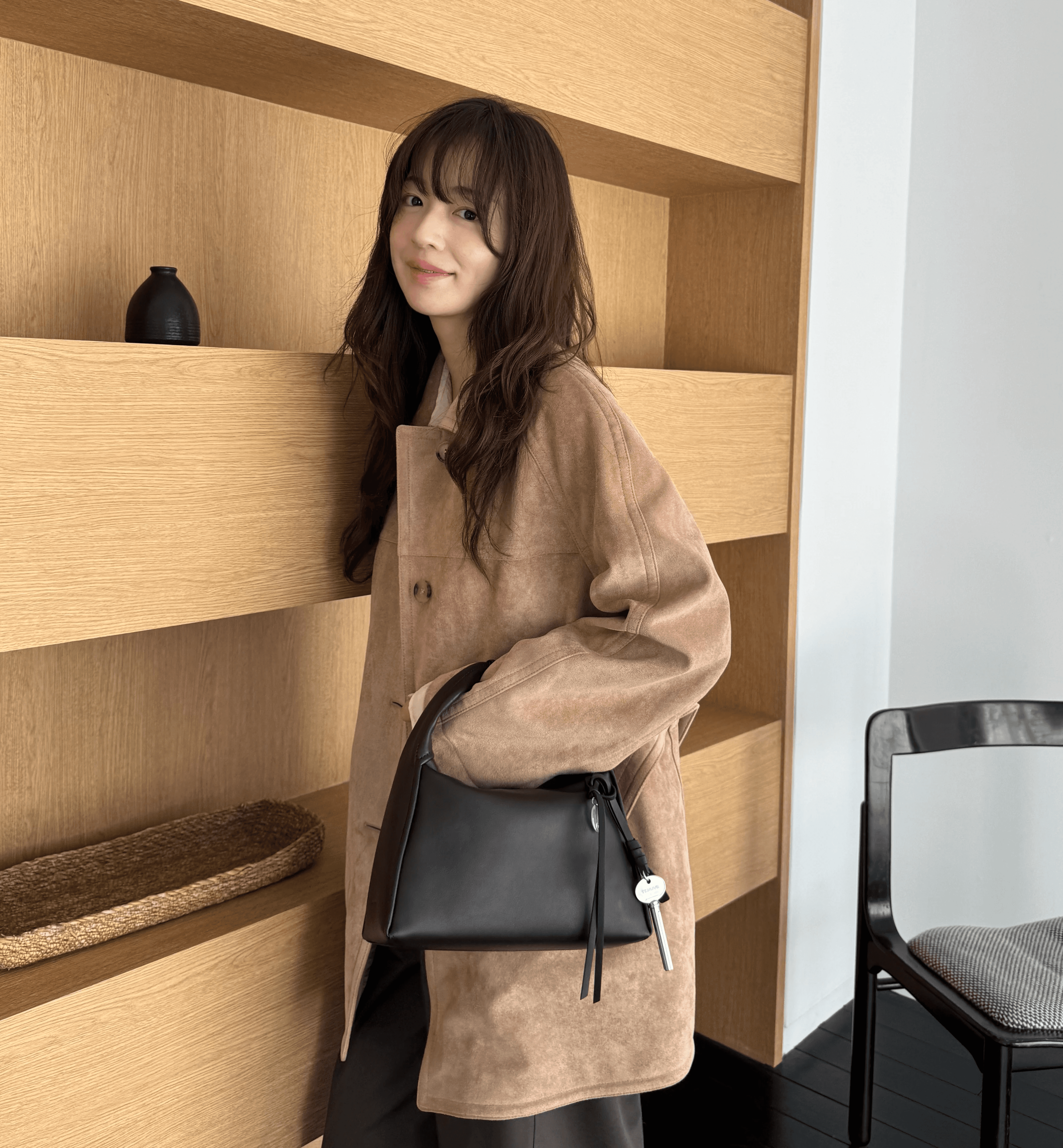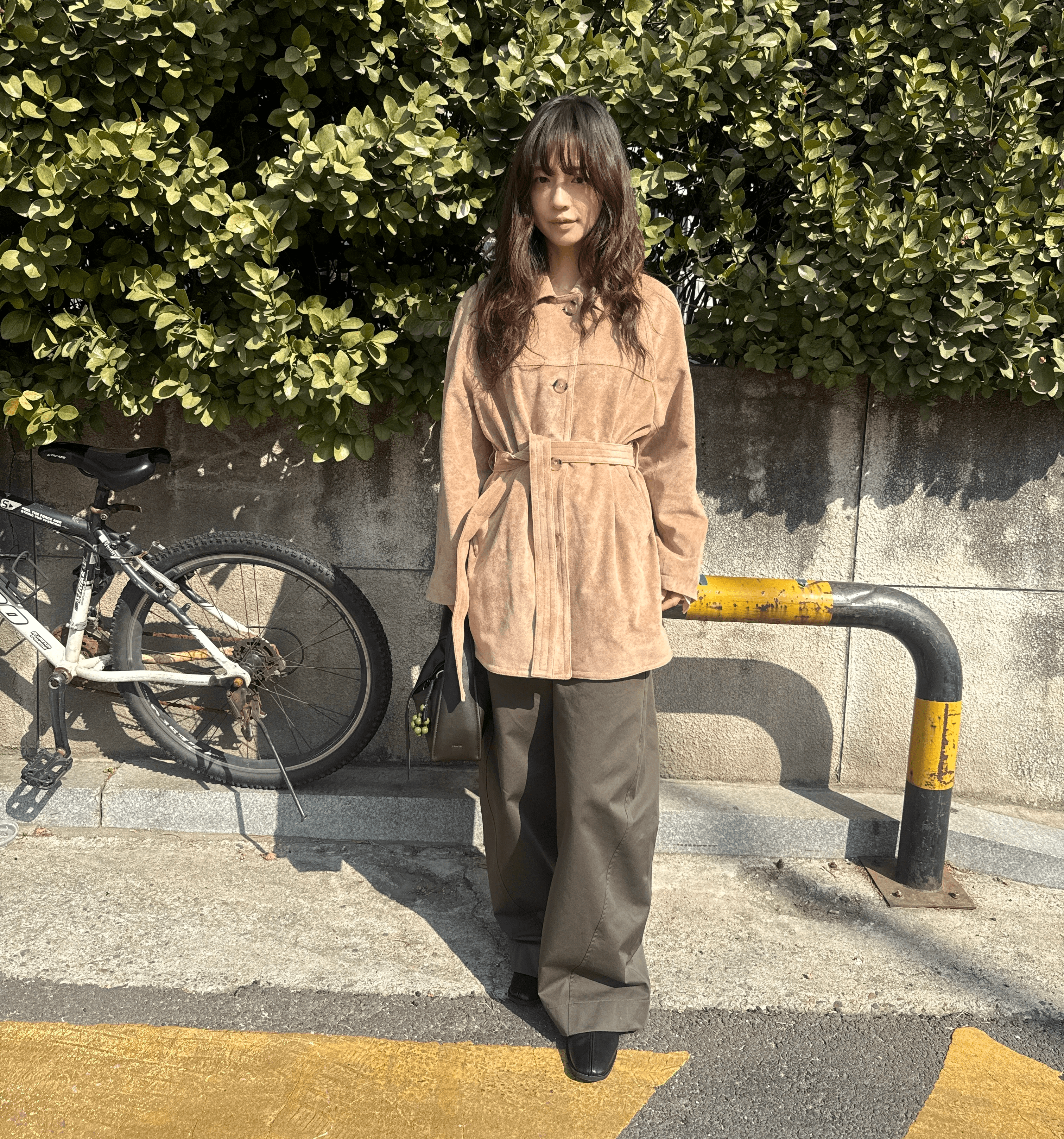 베이지 스웨이드 코트와 카울 넥 블라우스, 커브드 팬츠를 매치해 부드럽고 페미닌한 무드를 냈어요. 래글런 실루엣이 돋보이는 코트에 구조적인 프레 토트백을 더해 클래식하면서도 세련된 데일리 룩을 보여줍니다.