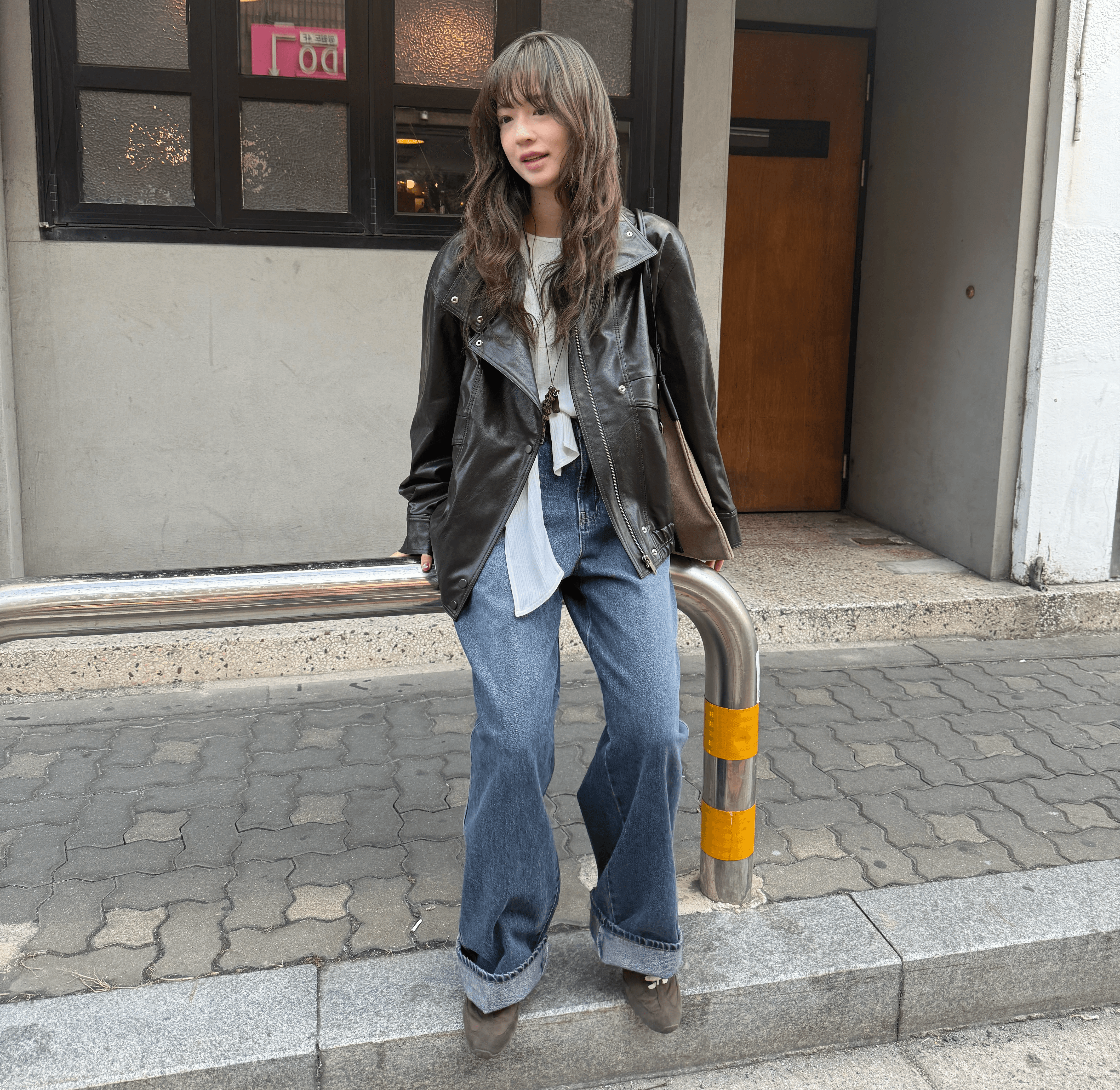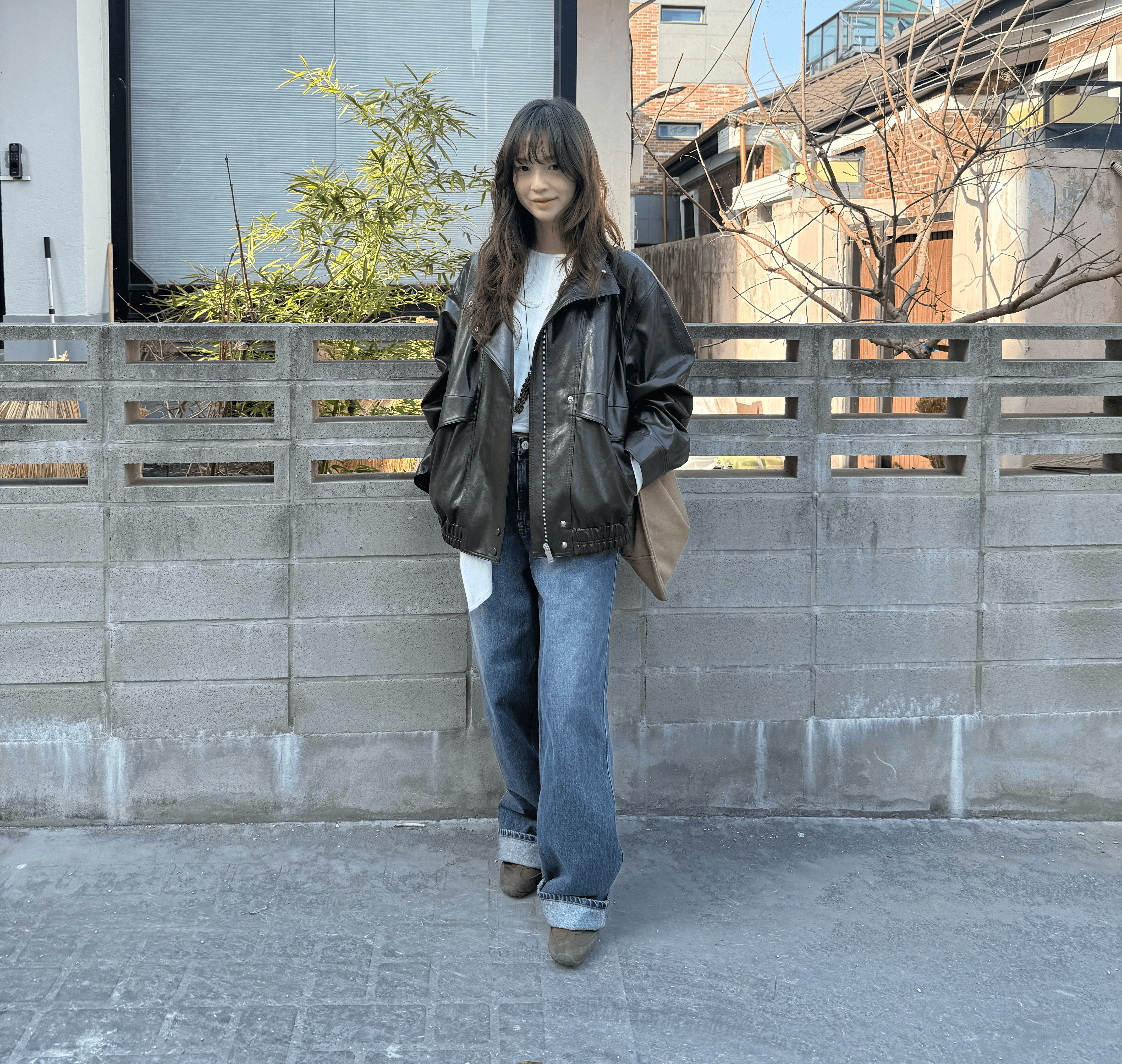 와이드 카라 가죽 점퍼와 세미 와이드 데님을 매치해 빈티지 캐주얼룩을 연출했어요. 사선 패널과 플랩 포켓이 매력적인 점퍼에 중청 워싱 데님을 더해, 쿨하면서도 여유로운 실루엣을 완성했답니다.