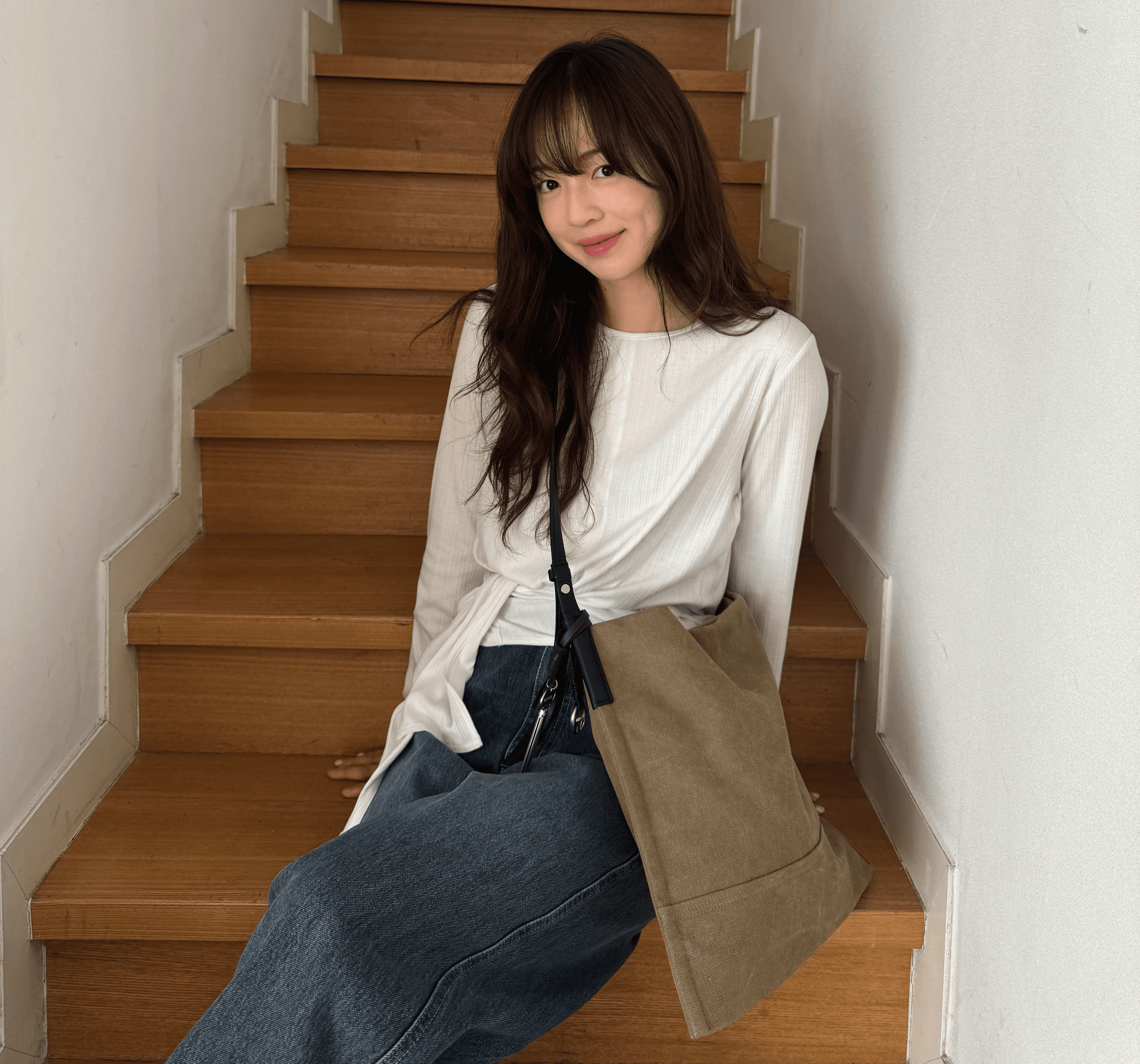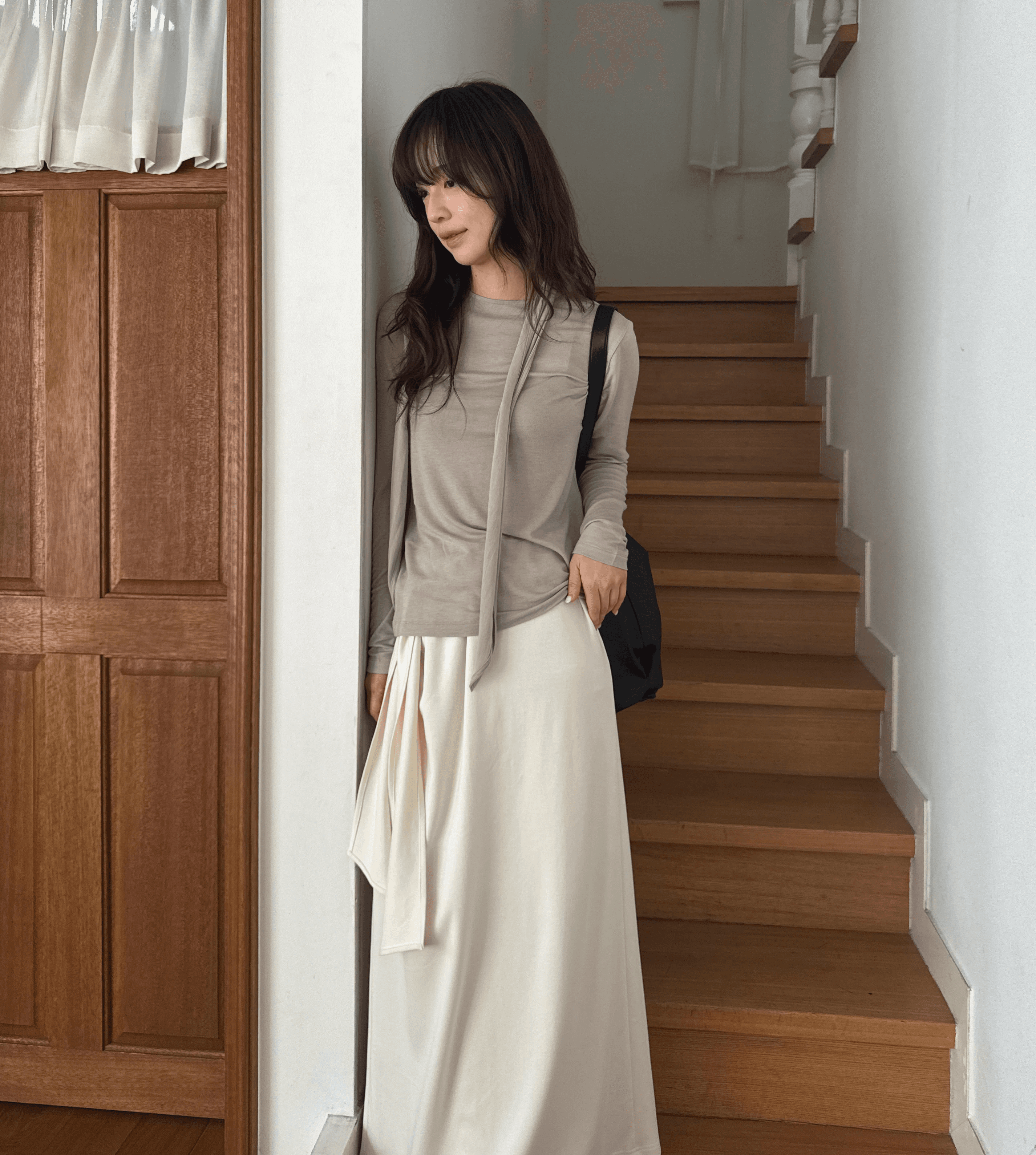 자연스러운 드레이프가 생기는 티셔츠와 슬림한 타피백으로 담백한 포인트를 주었어요. 숄더와 크로스 2-way로 연출할 수 있는 백 덕분에 일상에서 더욱 실용적으로 활용하기 좋은 룩이랍니다.